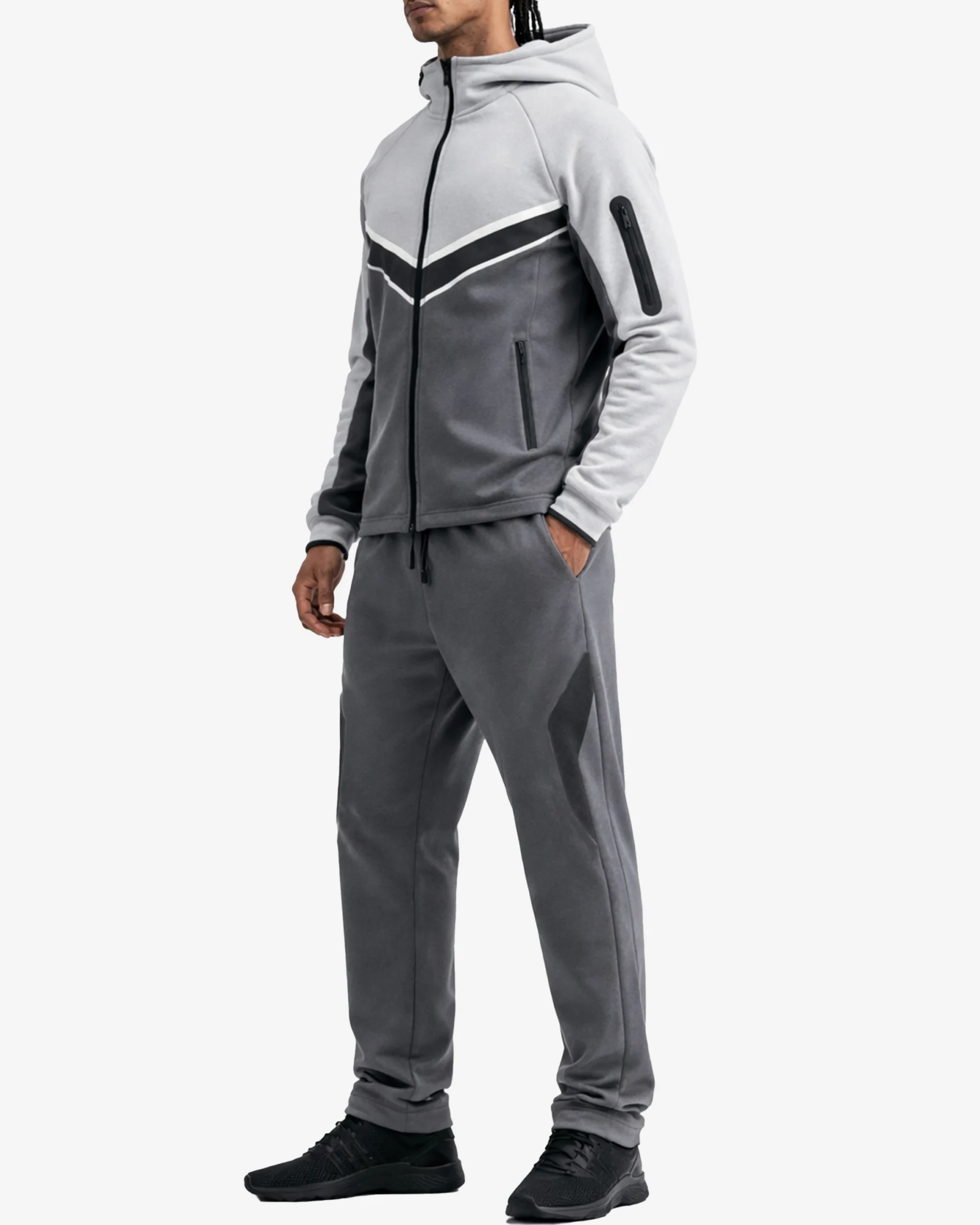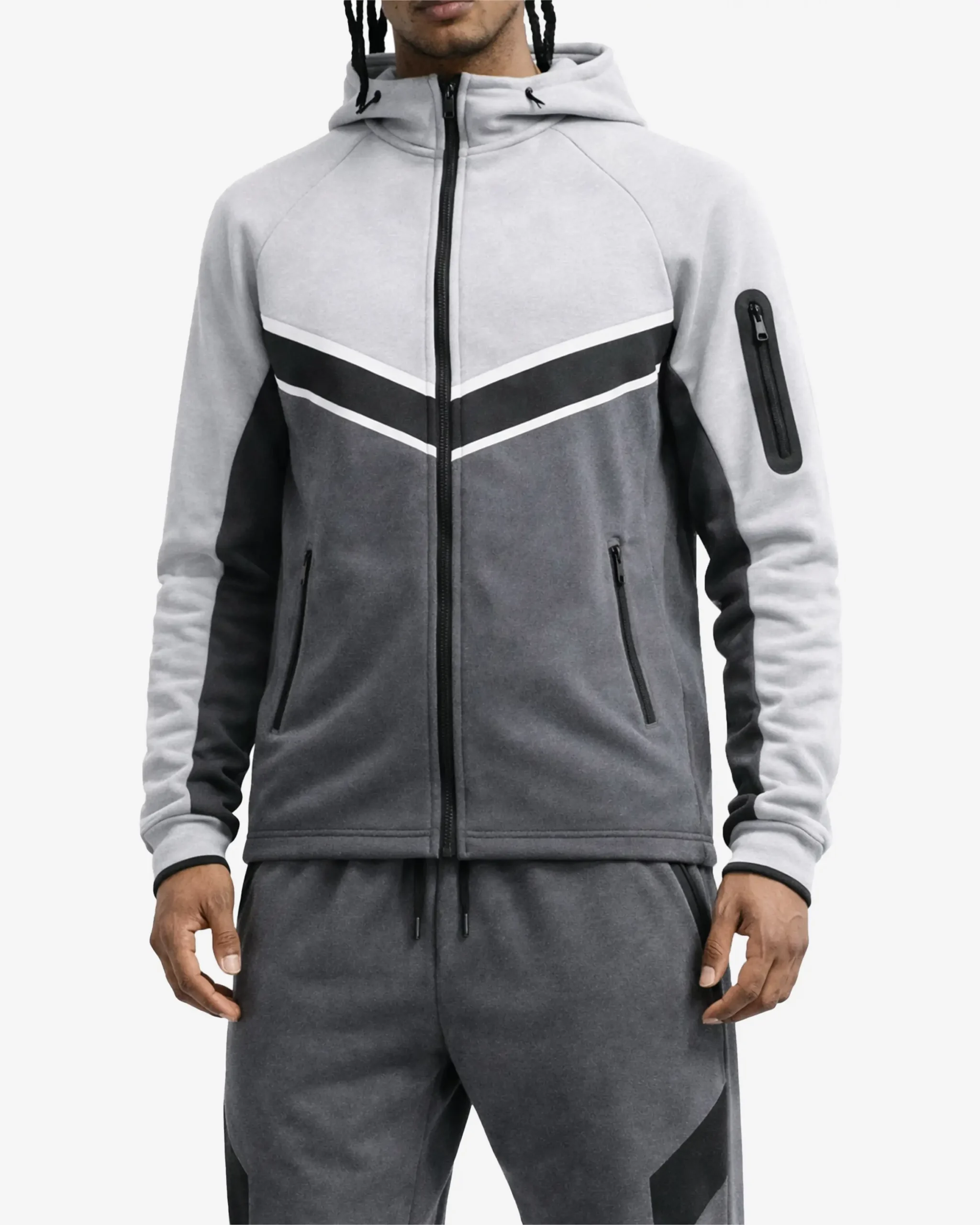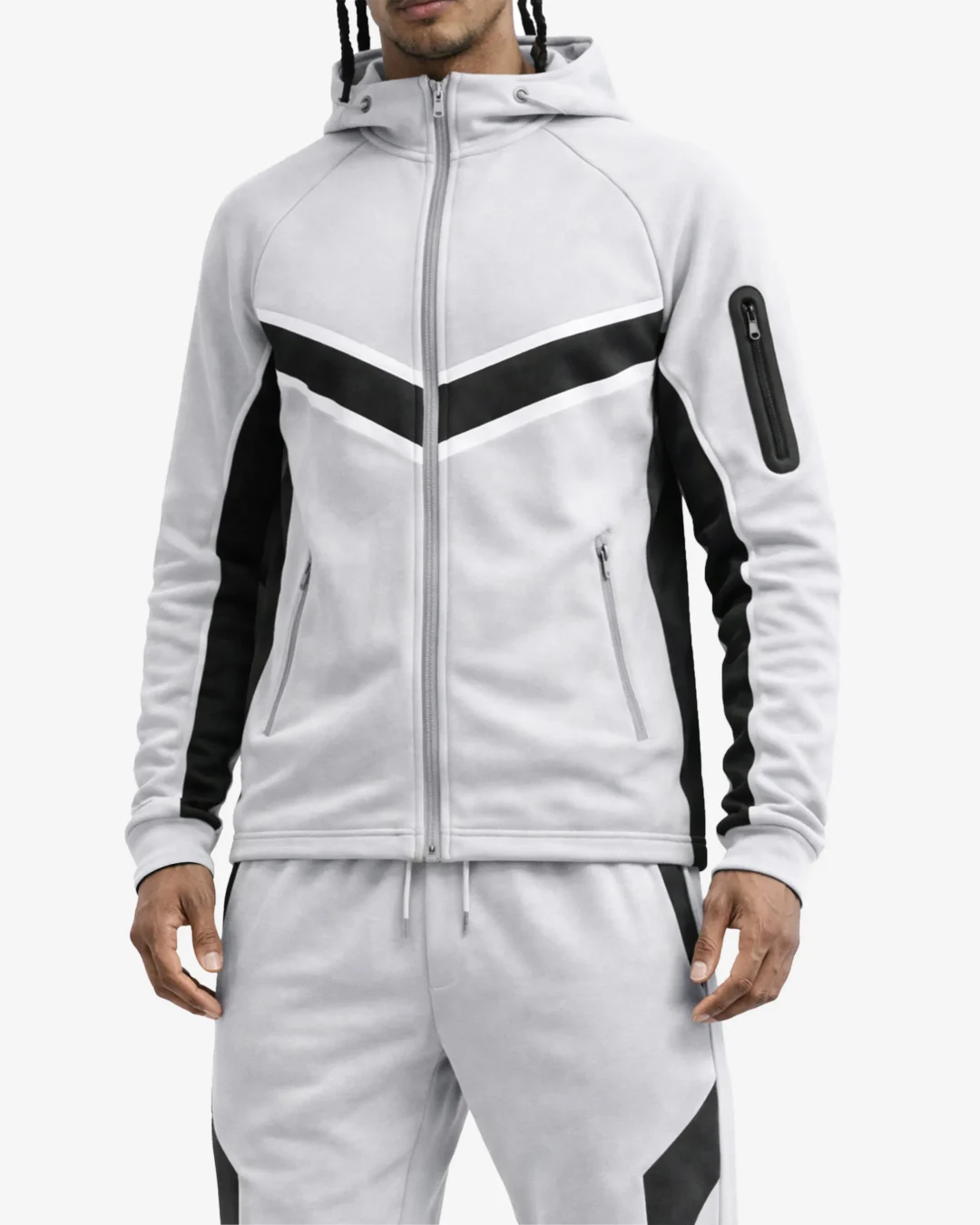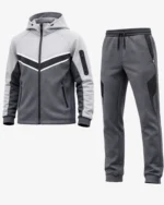 The tracksuit features a striking colorblock design with grey, white, and black tones arranged in a contemporary chevron pattern. The contrasting colors create a bold, athletic aesthetic that stands out whether you’re at the gym or running errands.