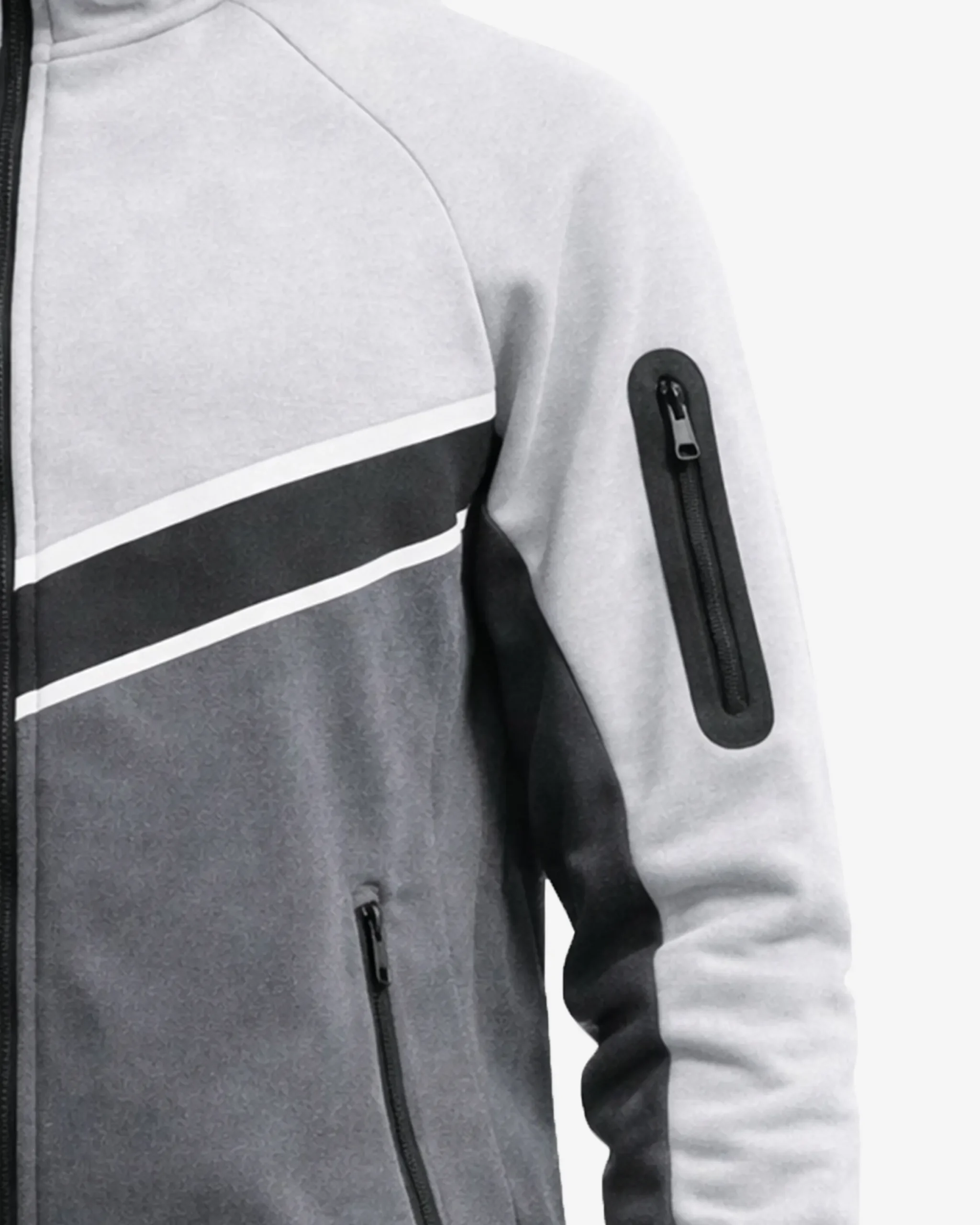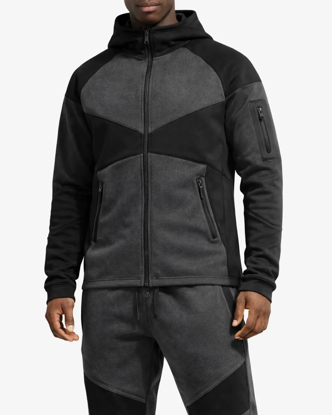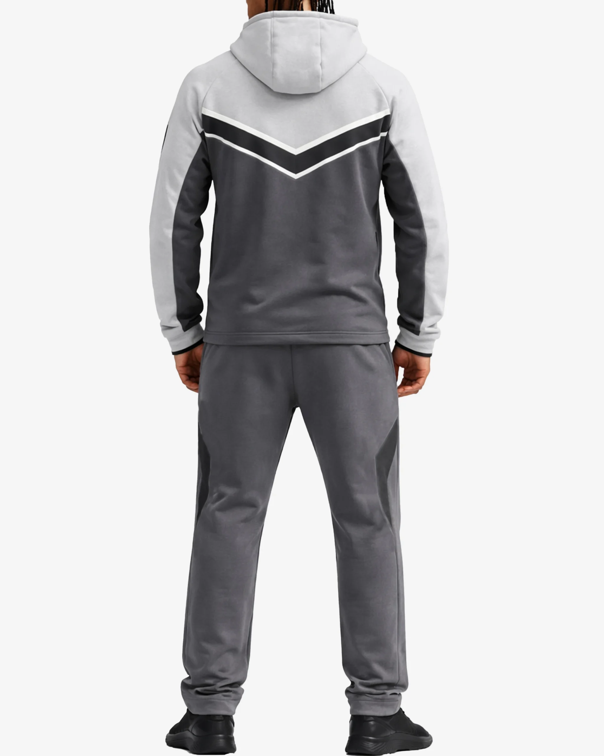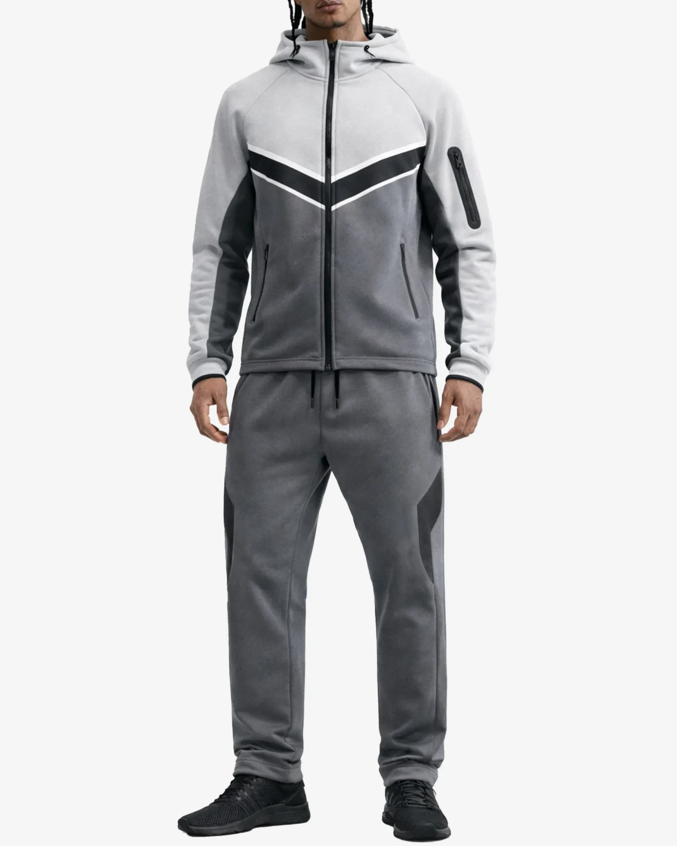 The tracksuit features a striking colorblock design with grey, white, and black tones arranged in a contemporary chevron pattern. The contrasting colors create a bold, athletic aesthetic that stands out whether you’re at the gym or running errands.