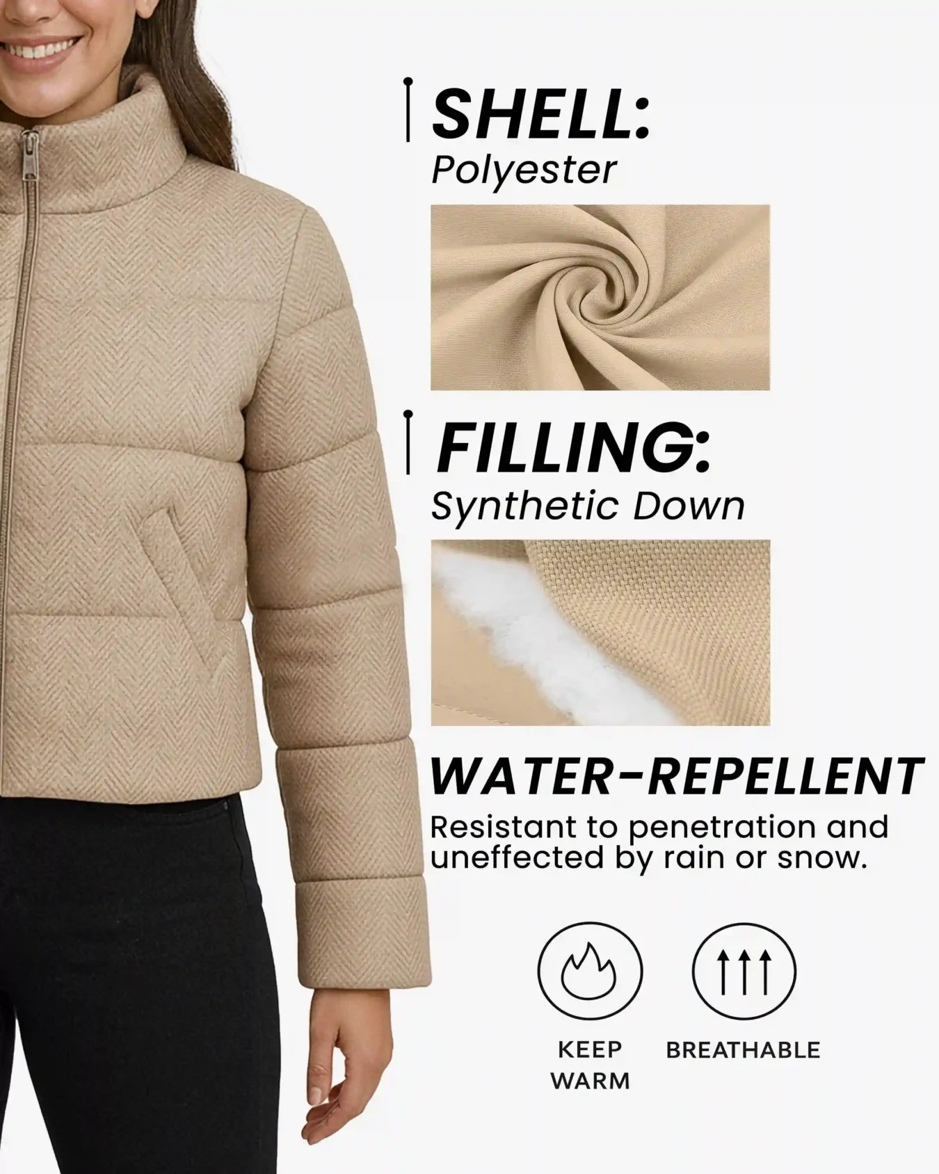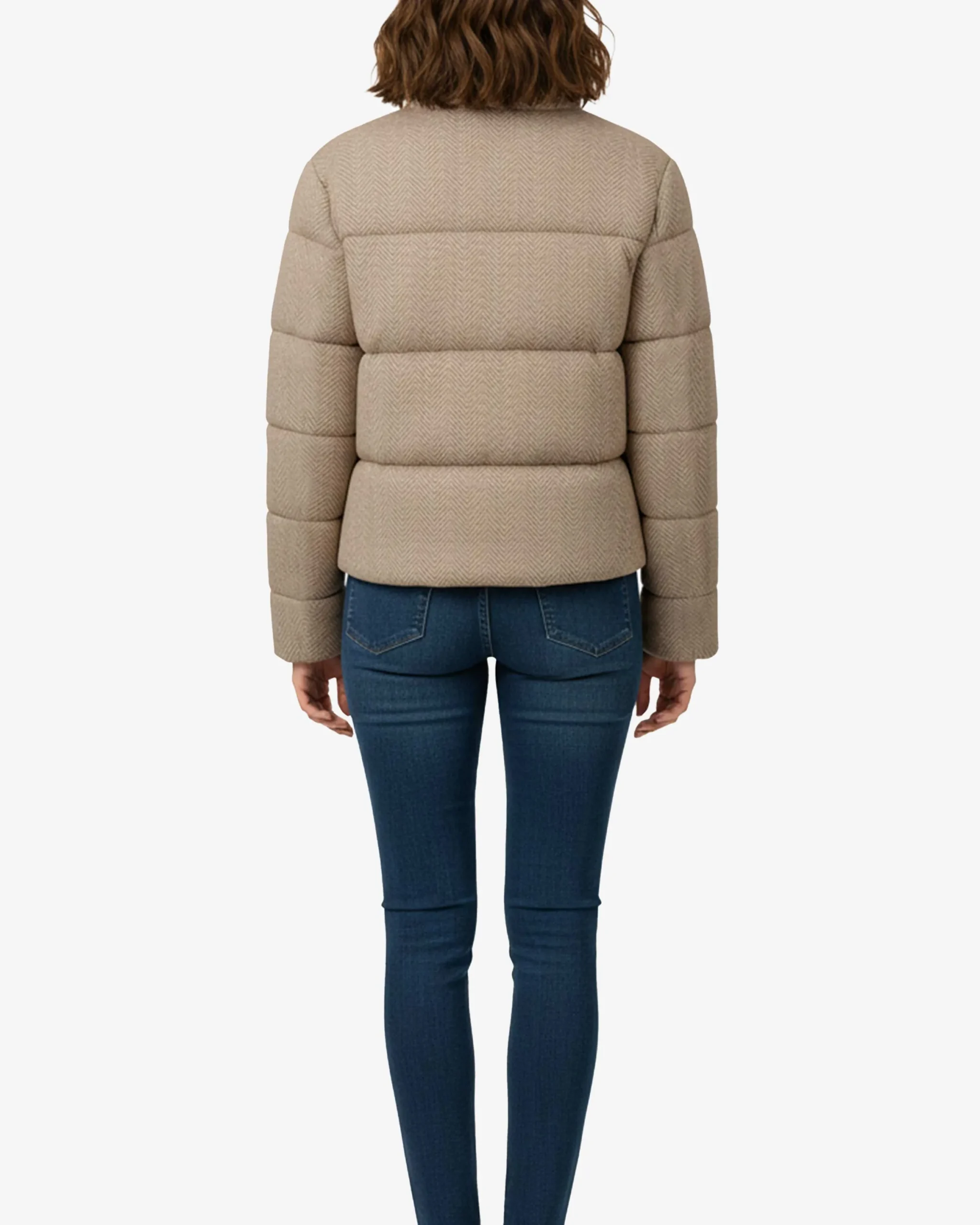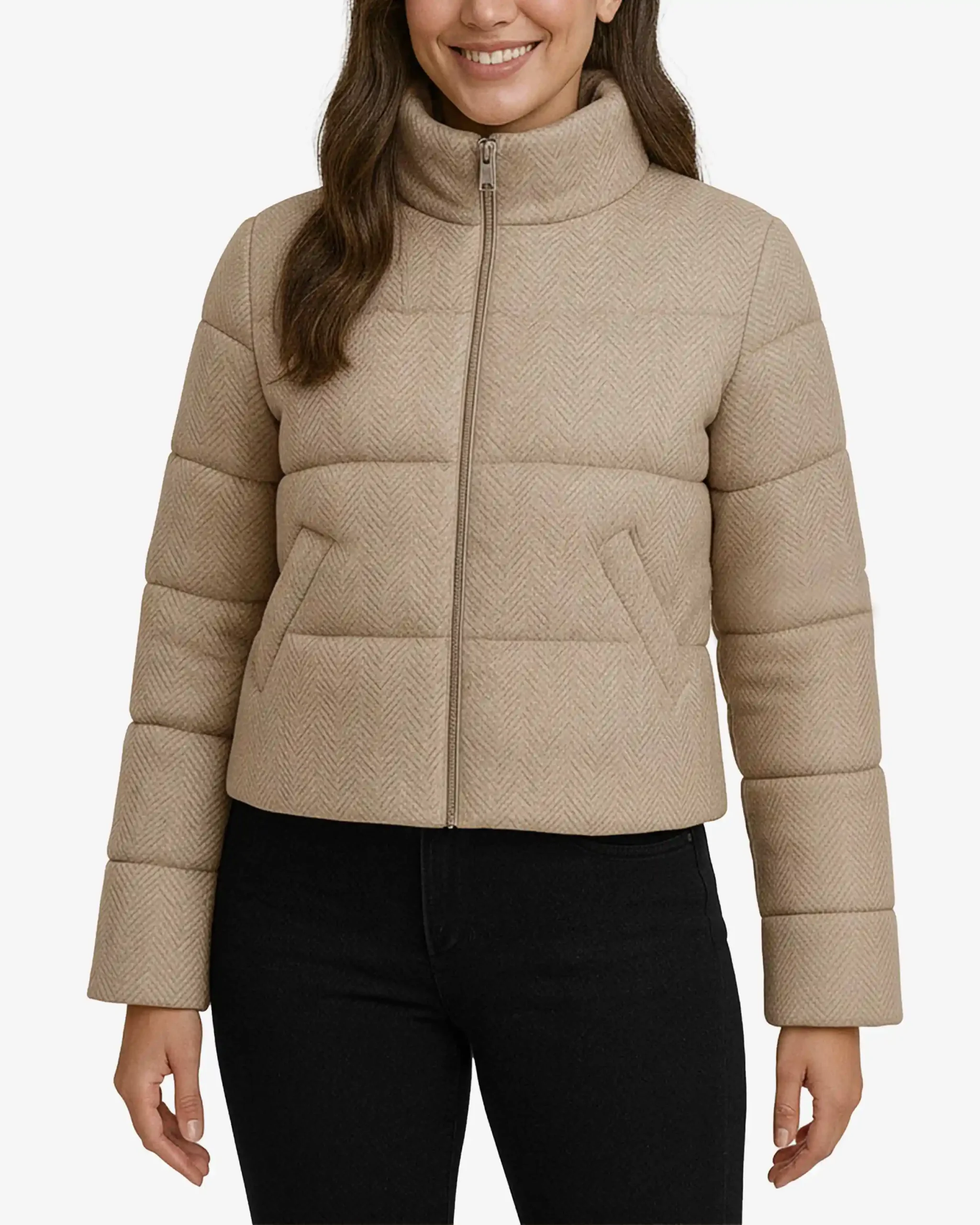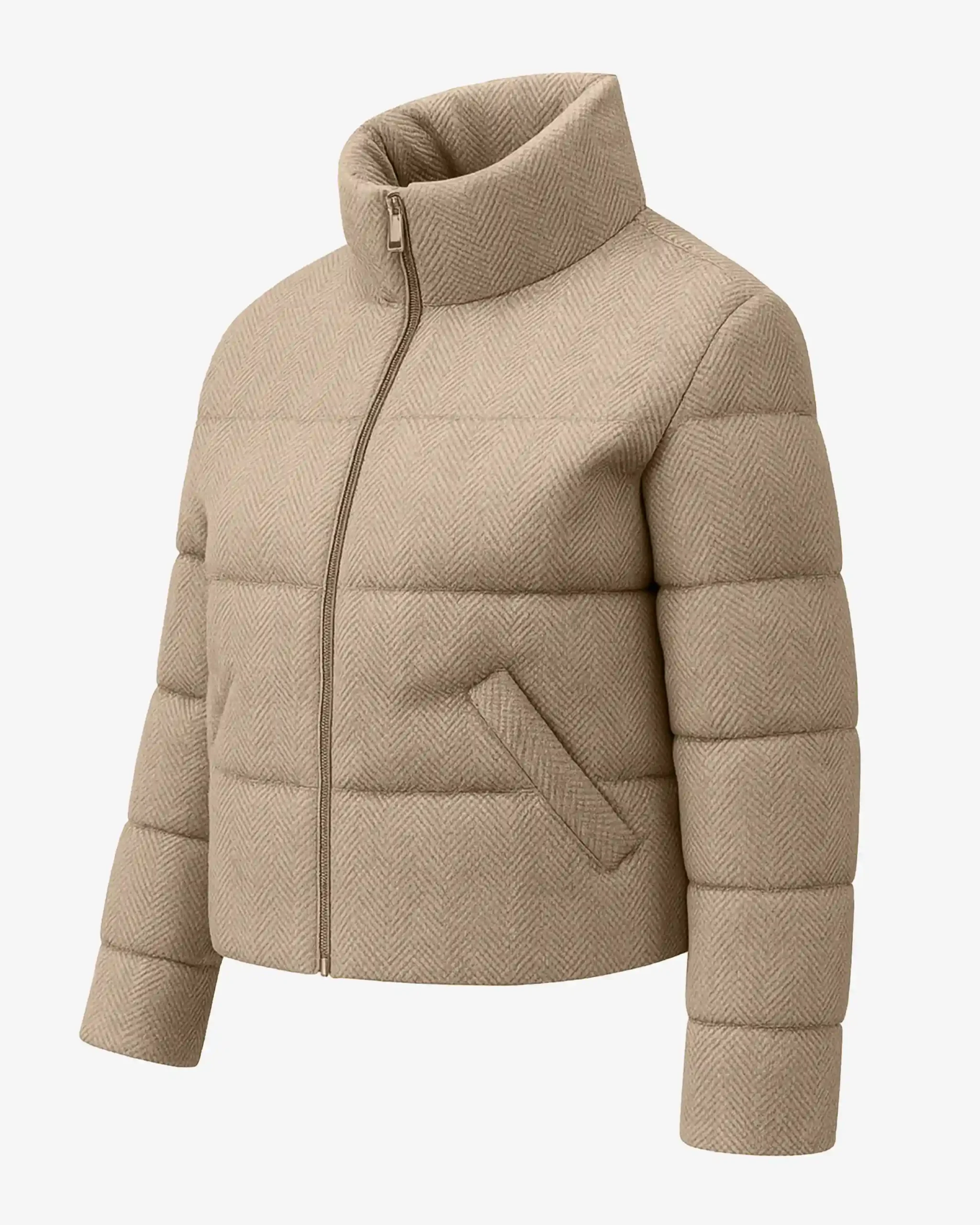 Herringbone Texture – The distinctive herringbone pattern adds visual interest and a premium tactile experience, elevating this puffer beyond basic winter wear. The textured fabric maintains its sophisticated appearance wash after wash.