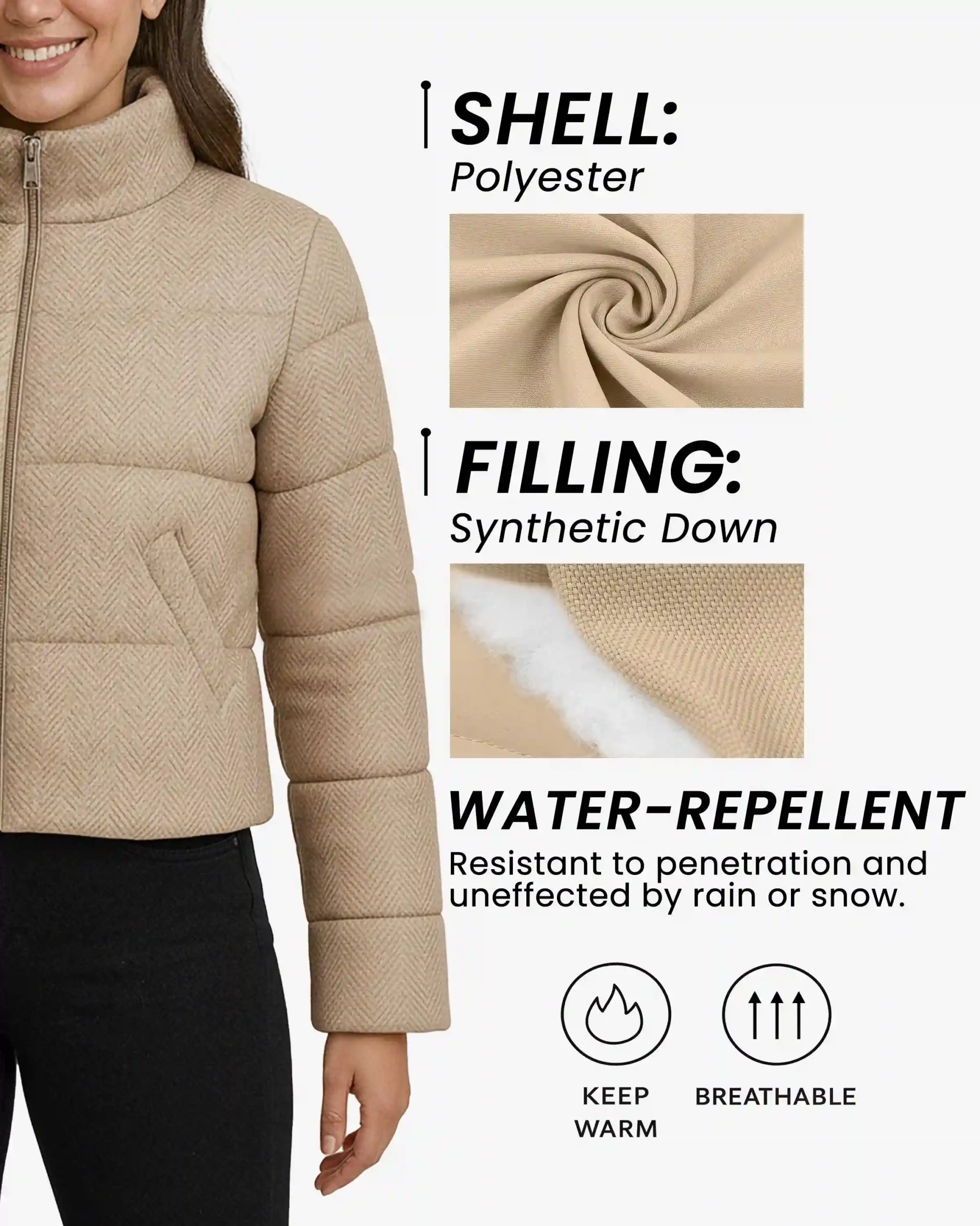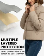 Superior Insulation – Filled with high-quality synthetic down alternative that delivers exceptional warmth without the weight or bulk, keeping you cozy in cold weather while maintaining a sleek, flattering silhouette.