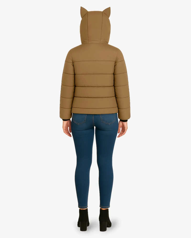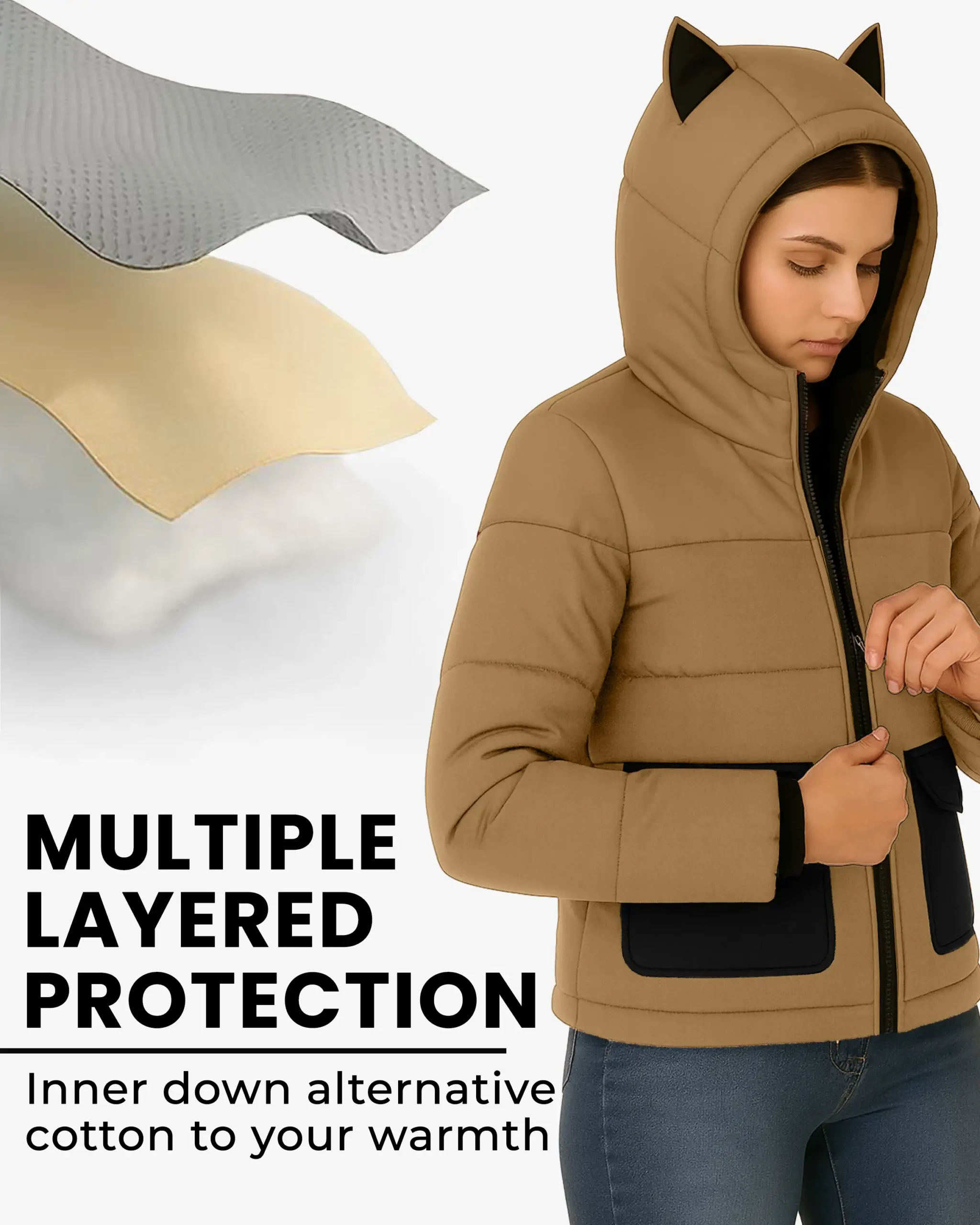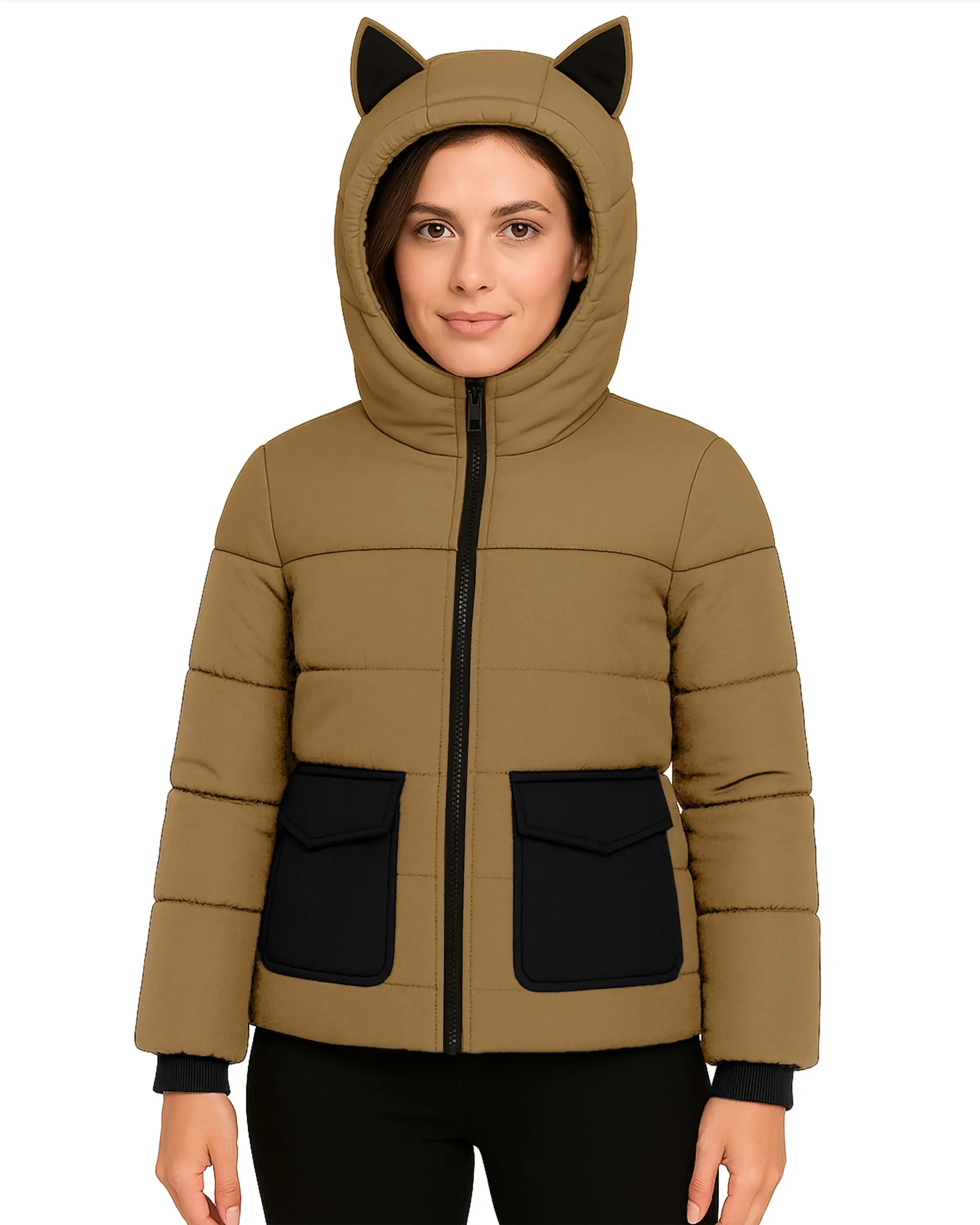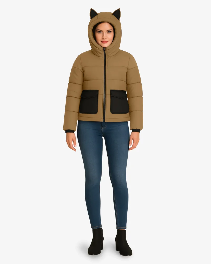 This Berry Black Hooded Puffer Jacket combines functionality with a fun, modern twist. Designed with a quilted build for warmth and insulation, it features a hood that provides extra protection against cold winds. Playful ear accents on the hood add a unique and trendy look, making this jacket stand out from standard puffers. Large front patch pockets add both practicality and style, while the lightweight construction ensures comfort for everyday wear. Perfect for casual outings, travel, or daily winter use, this jacket is a versatile addition to your wardrobe.