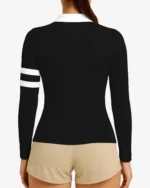 This shirt blends fashion and functionality perfectly. The black with white detail makes it look elegant, while the stretchy, moisture-wicking fabric delivers comfort in every movement.