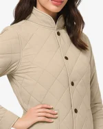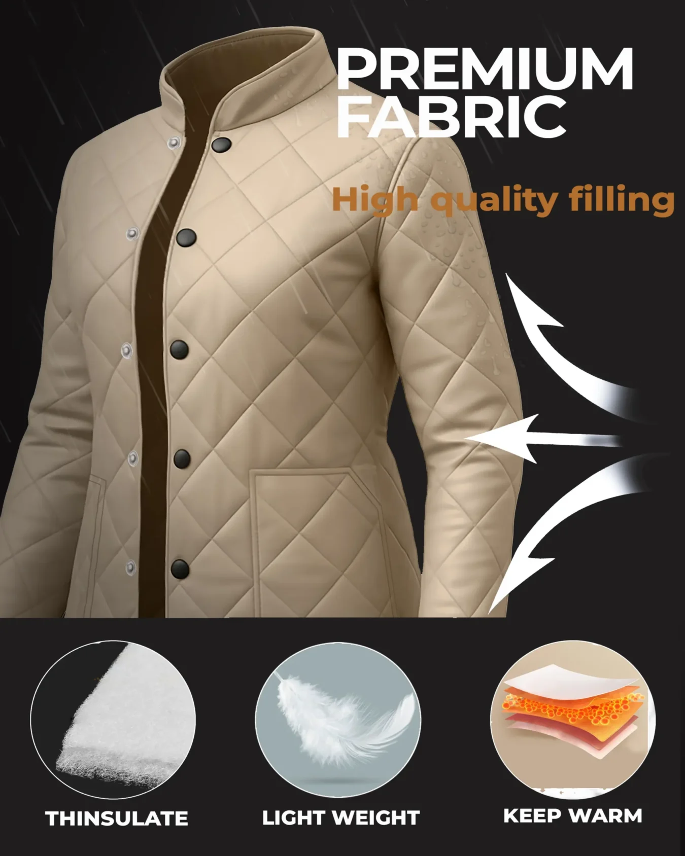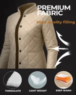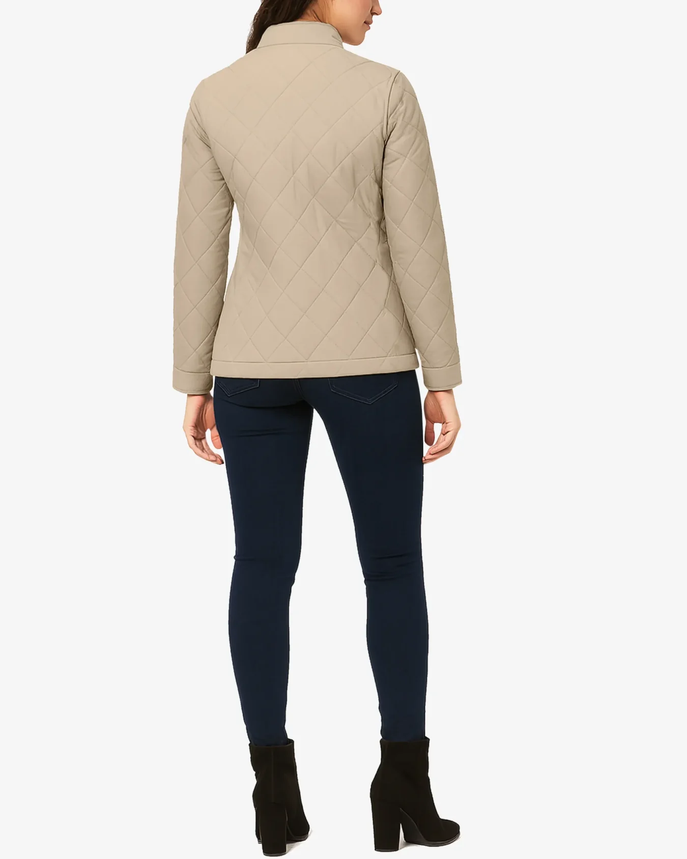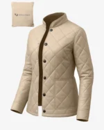 Introducing the CORAL Women’s Quilted Puffer Jacket, designed for women who want comfort, warmth, and elegance in one stylish outerwear piece. This jacket features a classic diamond-quilted pattern paired with lightweight Thinsulate insulation that keeps you warm without feeling bulky. Its water-resistant fabric protects against light rain and chilly winds, making it perfect for everyday outings, travel, or layering during colder seasons. The CORAL Jacket is also packable, allowing you to easily fold it into its own left zippered pocket, saving valuable space in your suitcase, handbag, or backpack. With a sleek stand collar, snap-button front, and a flattering fit, this jacket blends practicality with modern style ideal for work, travel, and weekend adventures.