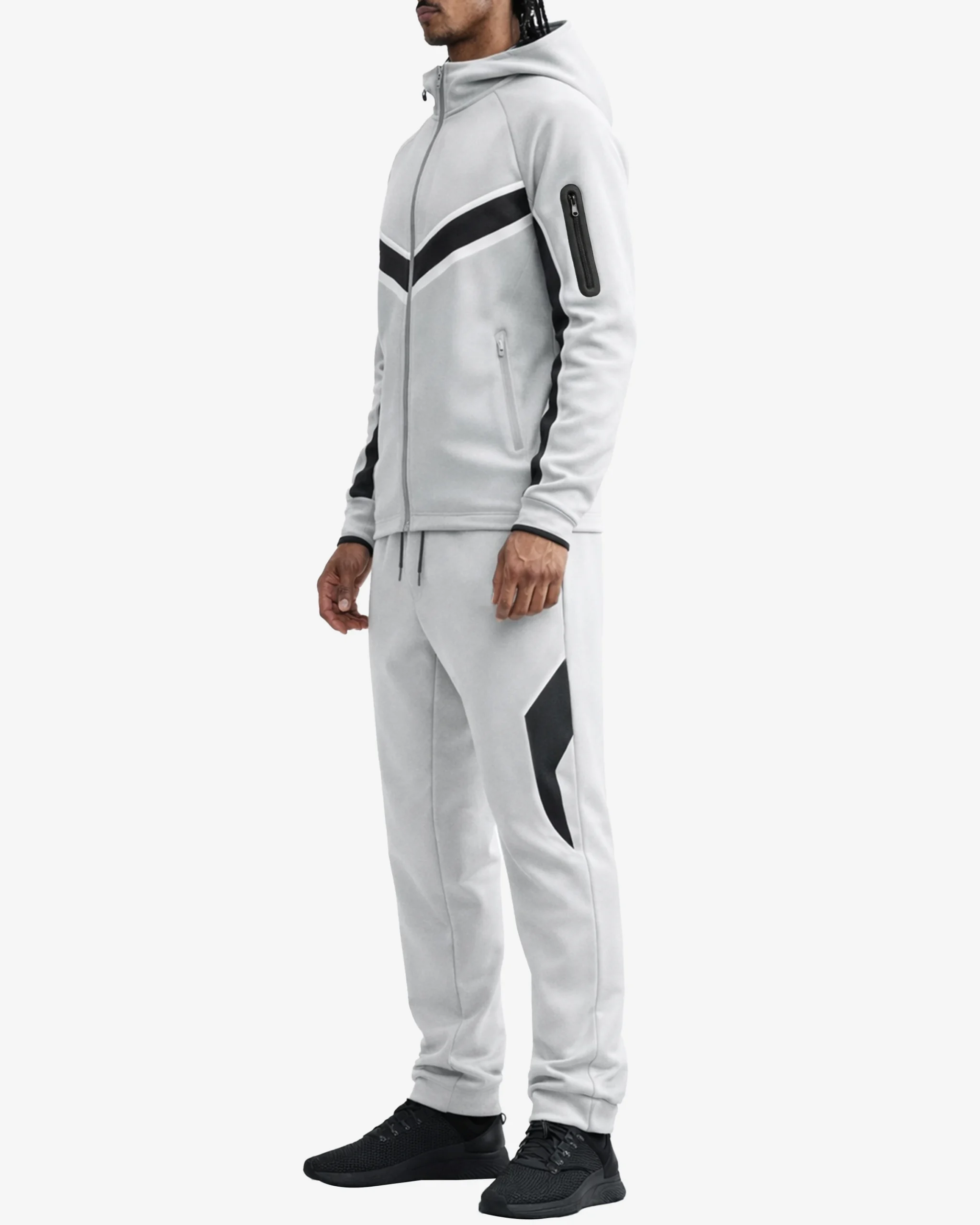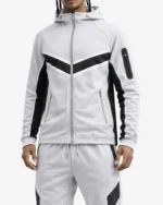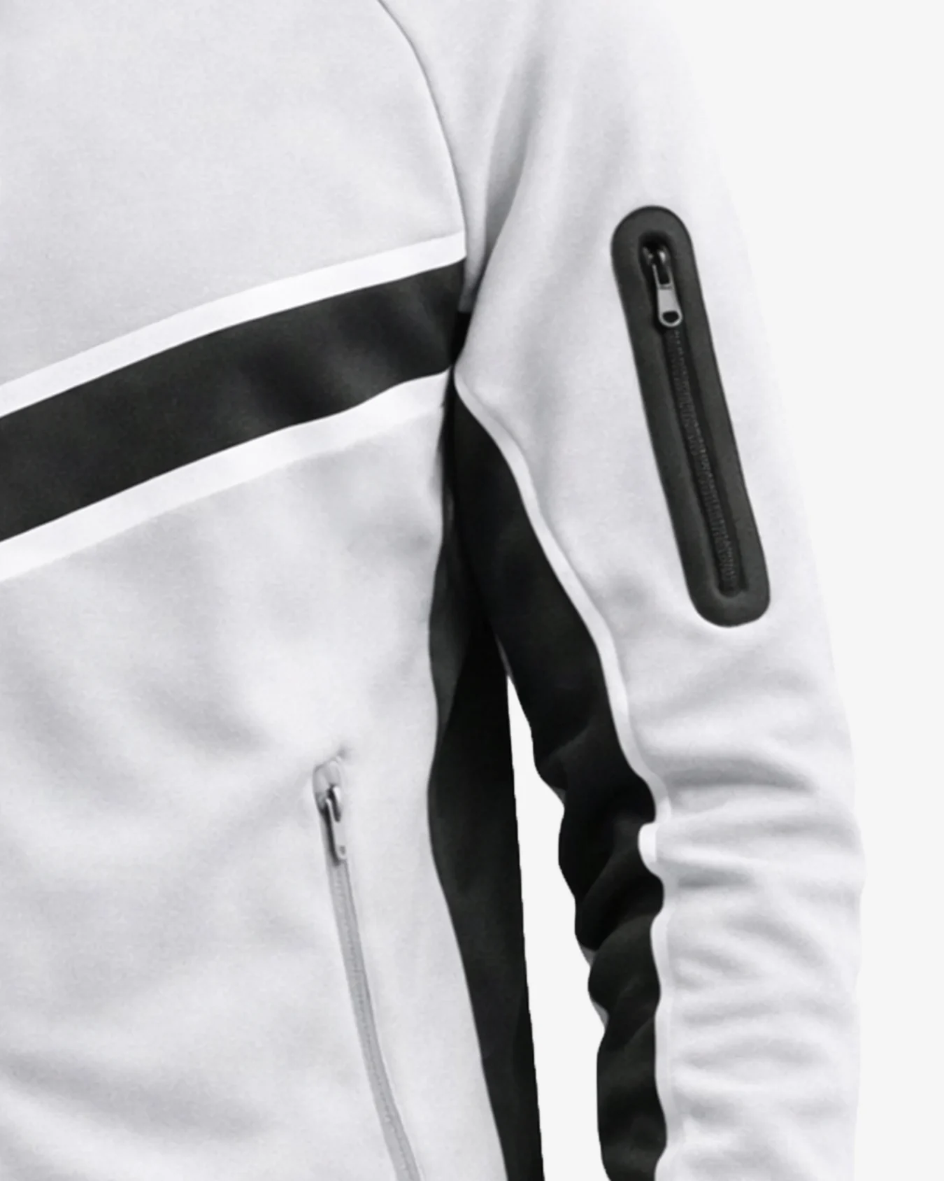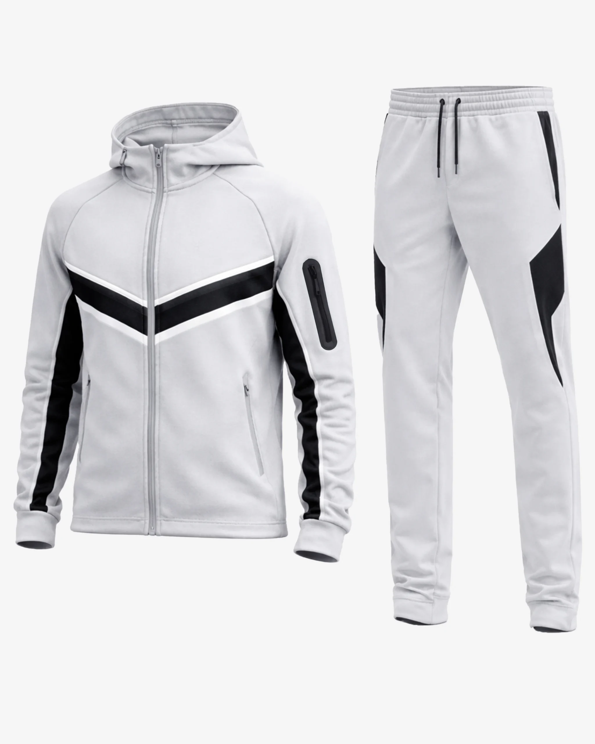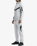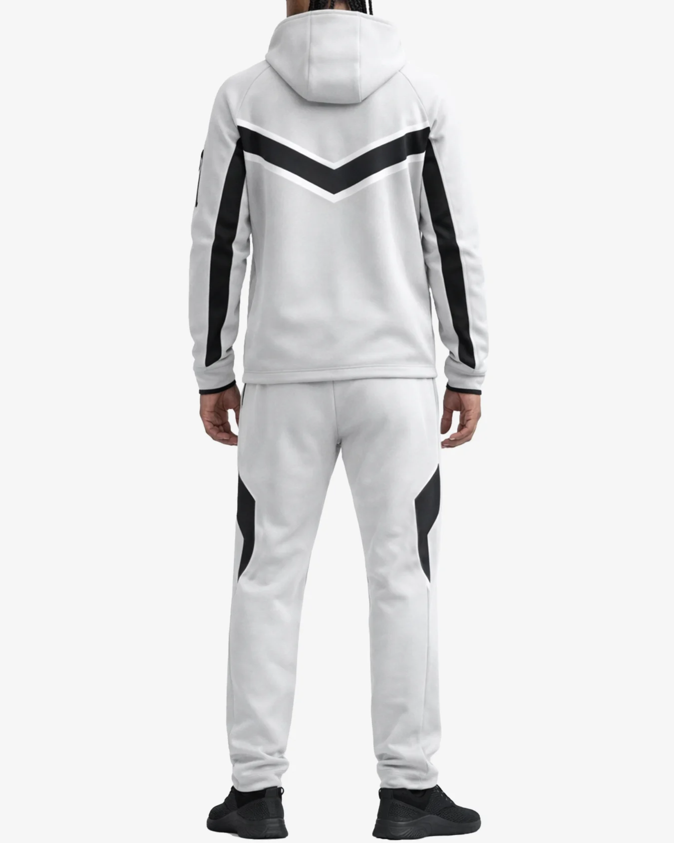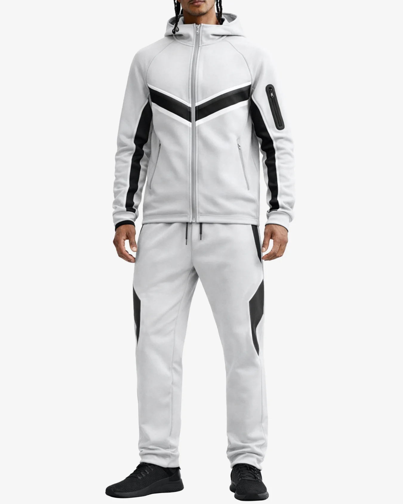 Distinctive Design: The tracksuit showcases a premium white colorway accented with bold black chevron stripes across the chest and sleek black side panels. This eye-catching colorblock design creates a dynamic, sporty aesthetic that stands out whether you’re at the gym, on the track, or out in the city. The crisp white base contrasts beautifully with the black accents, creating a fresh, clean look that’s both timeless and on-trend.