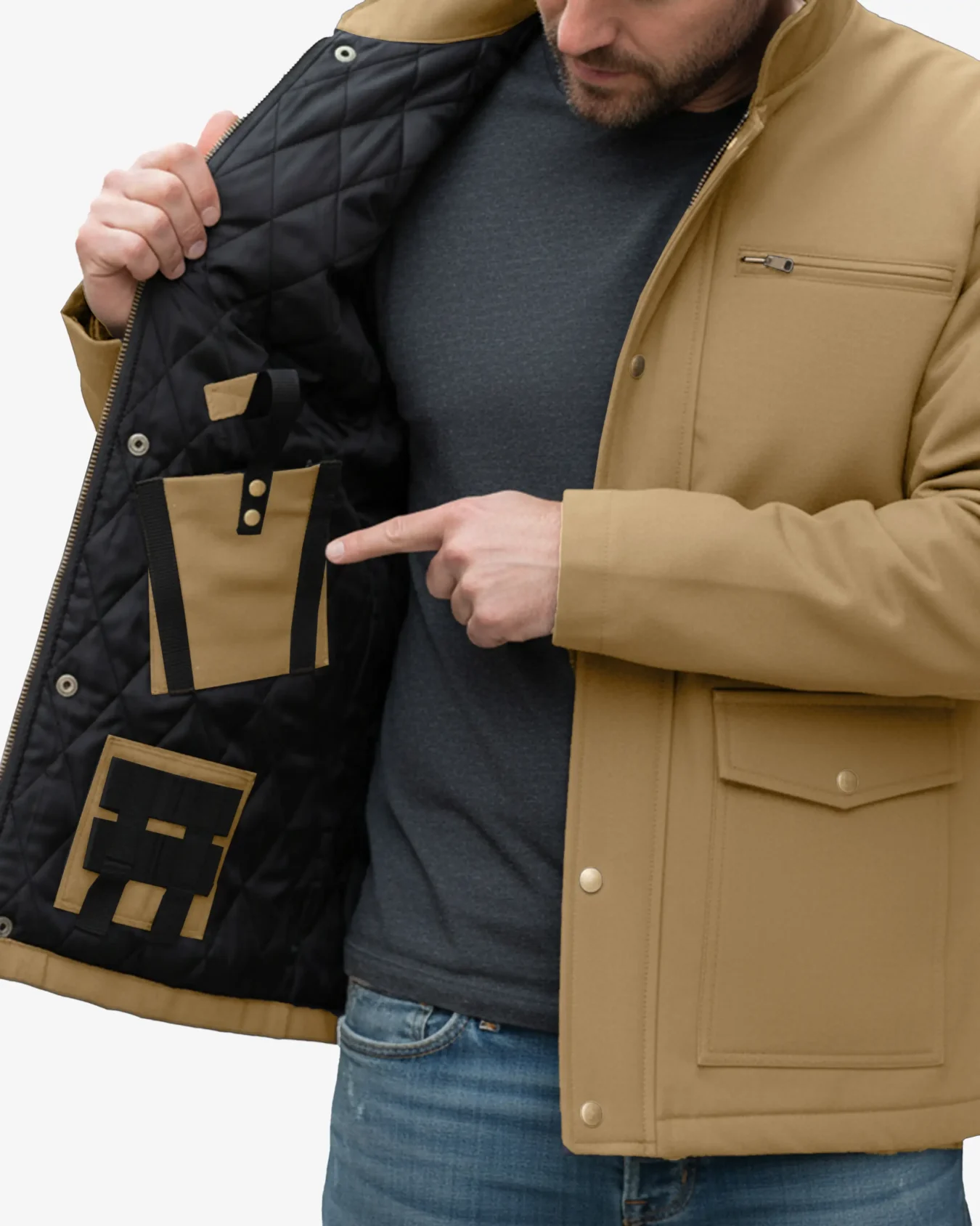 What sets the COVERT jacket apart is its intelligently designed interior concealed carry system. The jacket features dedicated ambidextrous holster pockets built into the quilted black lining, allowing both right-handed and left-handed users to carry their firearm securely and comfortably. The internal CCW compartments are strategically positioned for quick access while maintaining complete discretion – no one will know you’re carrying unless you want them to.