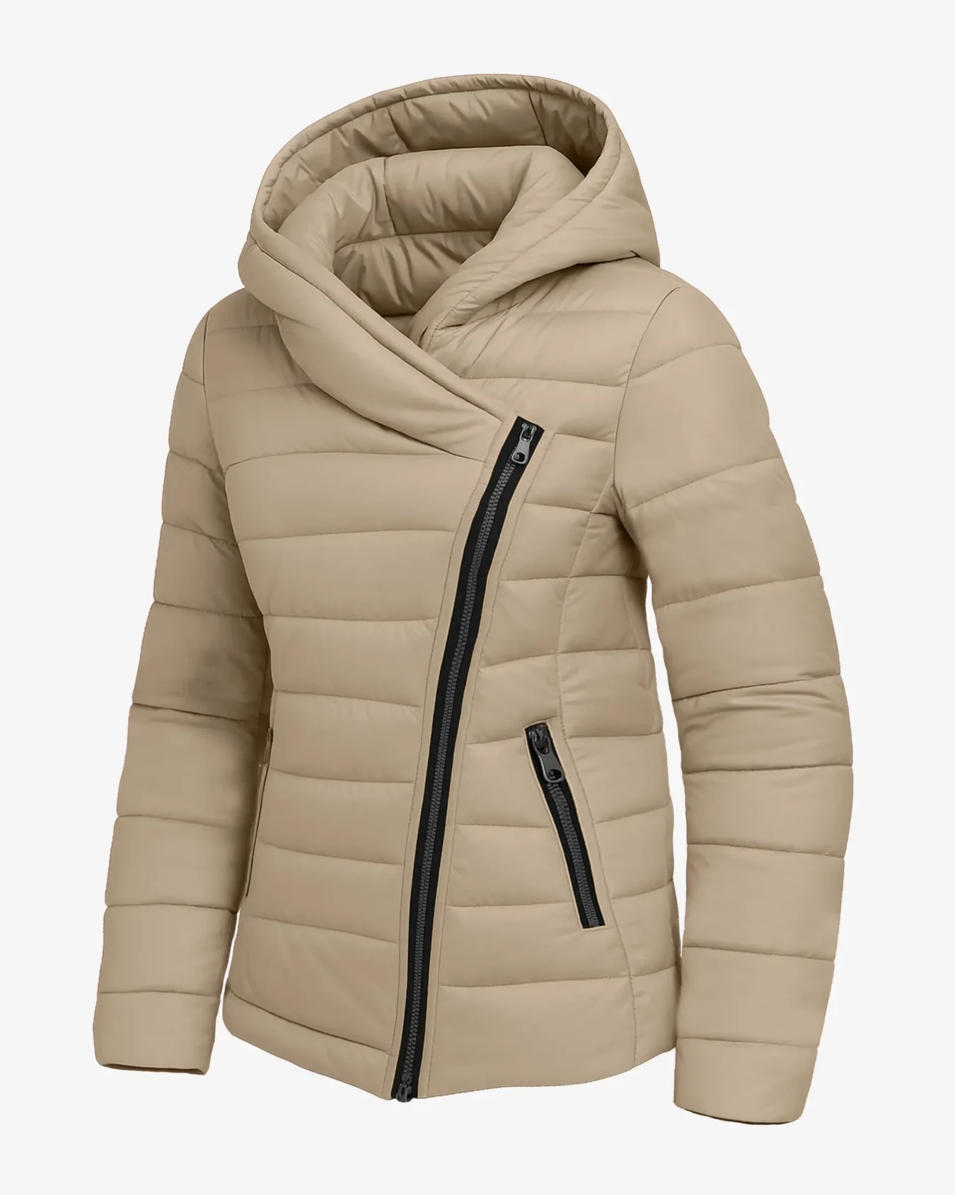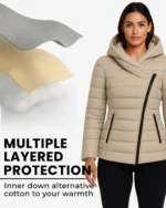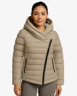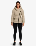 This women’s asymmetrical zip puffer jacket is a perfect blend of practicality and contemporary fashion. The quilted construction offers reliable insulation without adding bulk, keeping you warm and comfortable in cold weather. Its standout feature is the asymmetrical zipper design, giving it a chic and modern look. The attached hood provides extra protection from chilly winds, while zippered side pockets add both functionality and security for your essentials. With its stylish cut and versatile appeal, this jacket is a must-have for winter wardrobes.