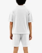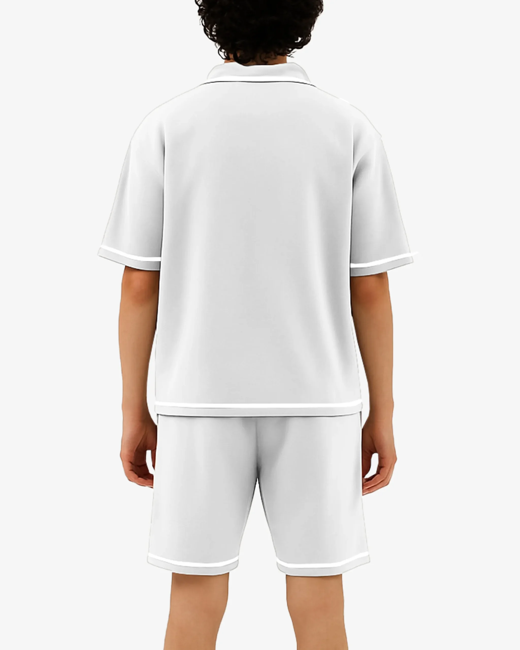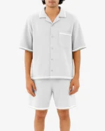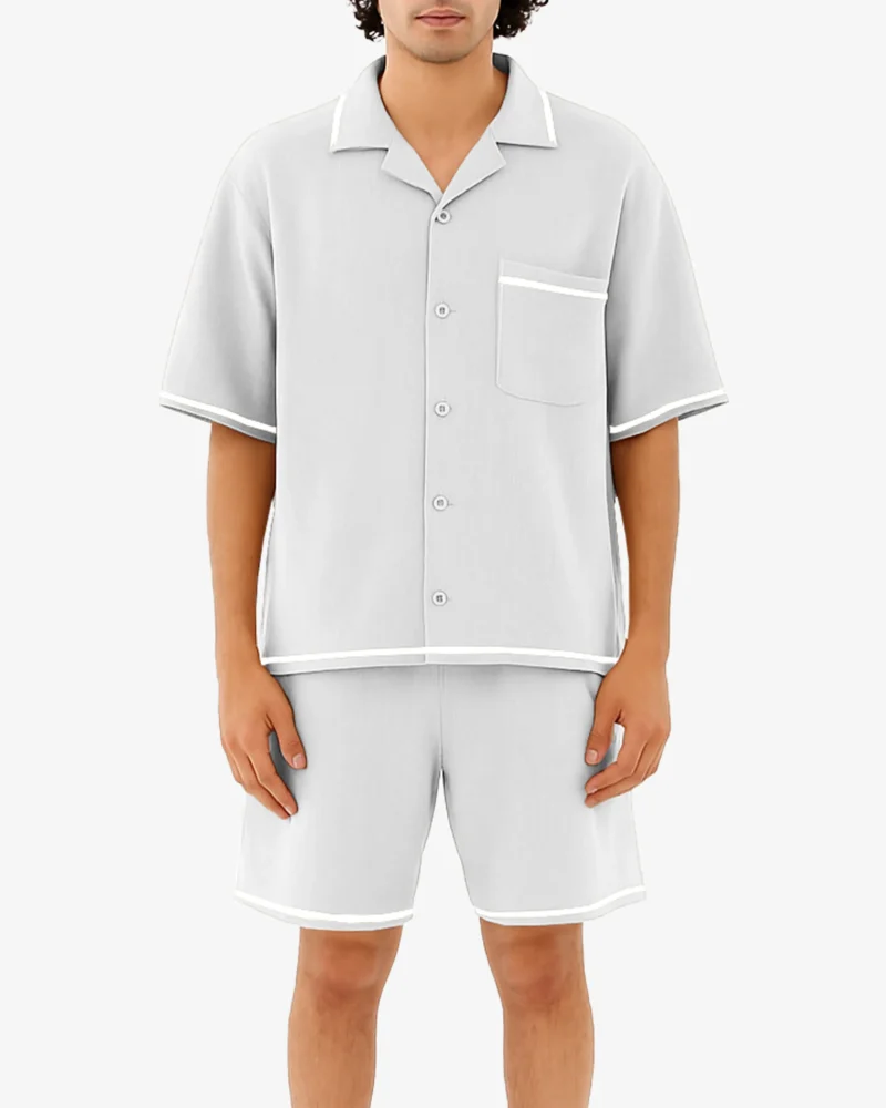 The shirt features a button-up front, open collar, and sleek contrast piping for a touch of sophistication. The matching shorts offer an easy fit with an elastic waistband — giving you complete freedom of movement without sacrificing style.