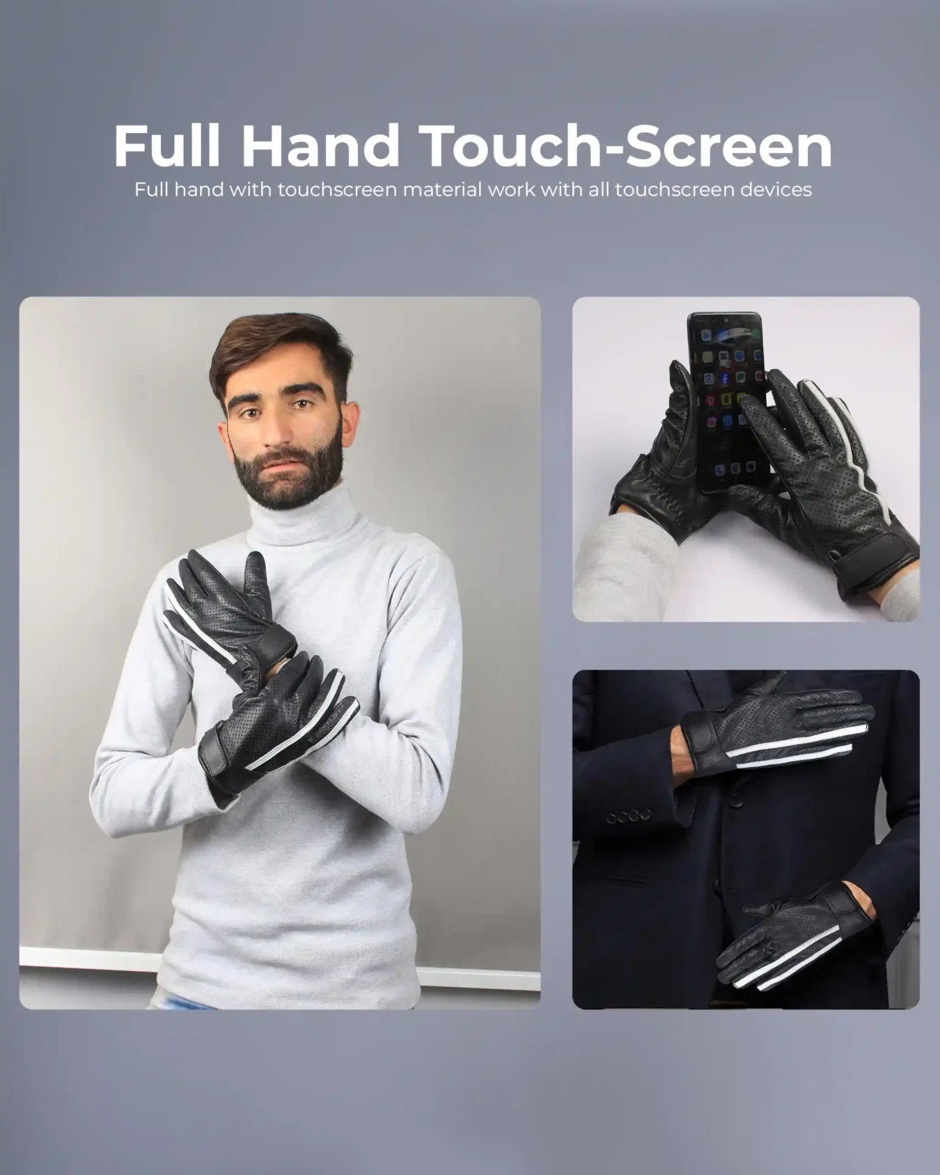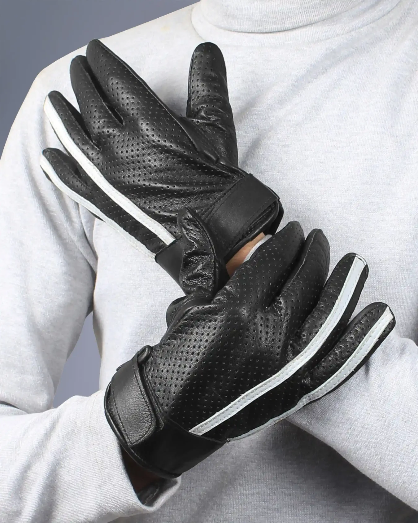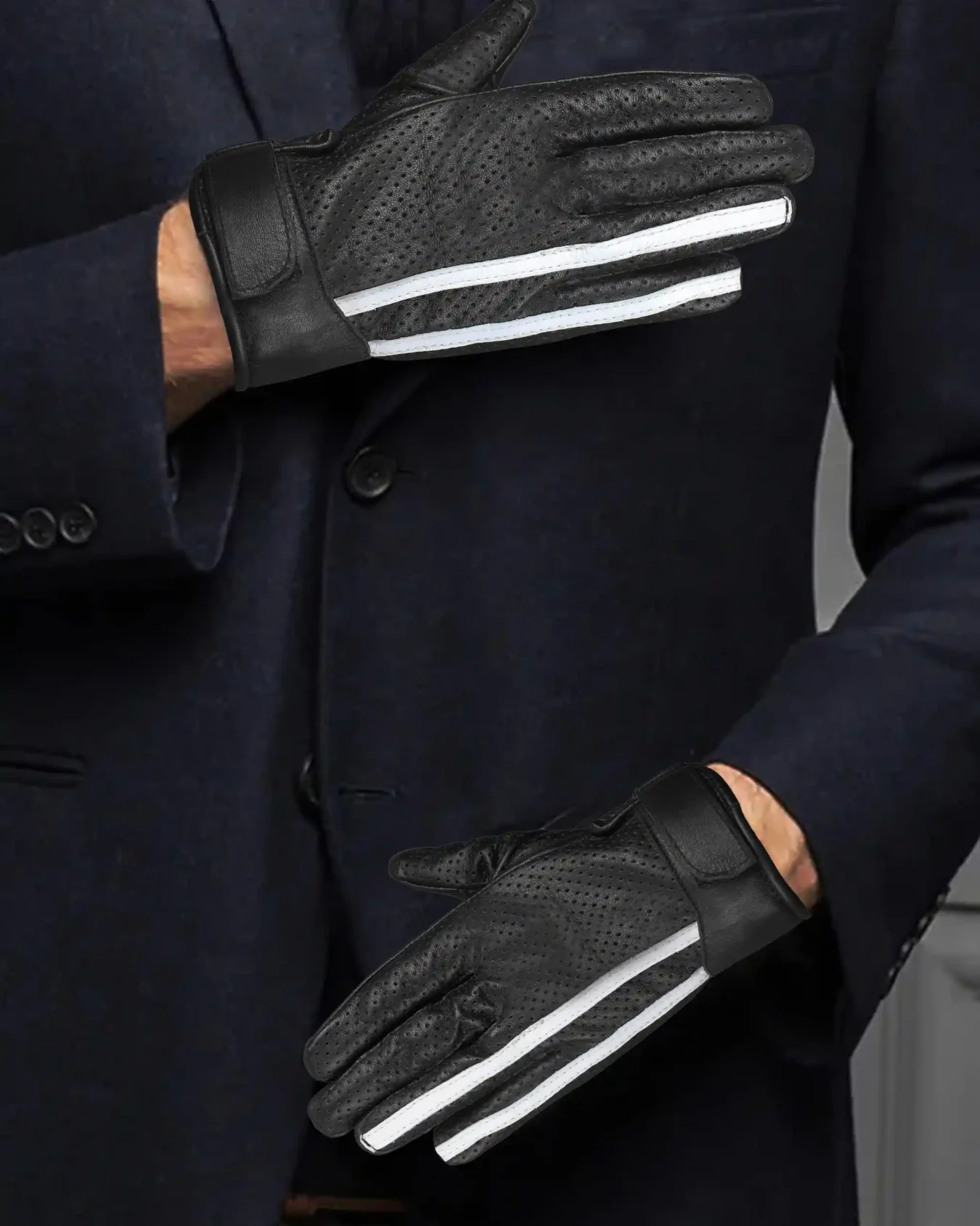 Elevate your style with our mens black leather gloves, where timeless sophistication meets modern flair. Crafted from premium black leather with contrasting white stripes, these mens leather winter gloves offer unparalleled comfort, durability, and versatility. Perfect for urban landscapes or formal events, the supple leather ensures a snug yet flexible fit.