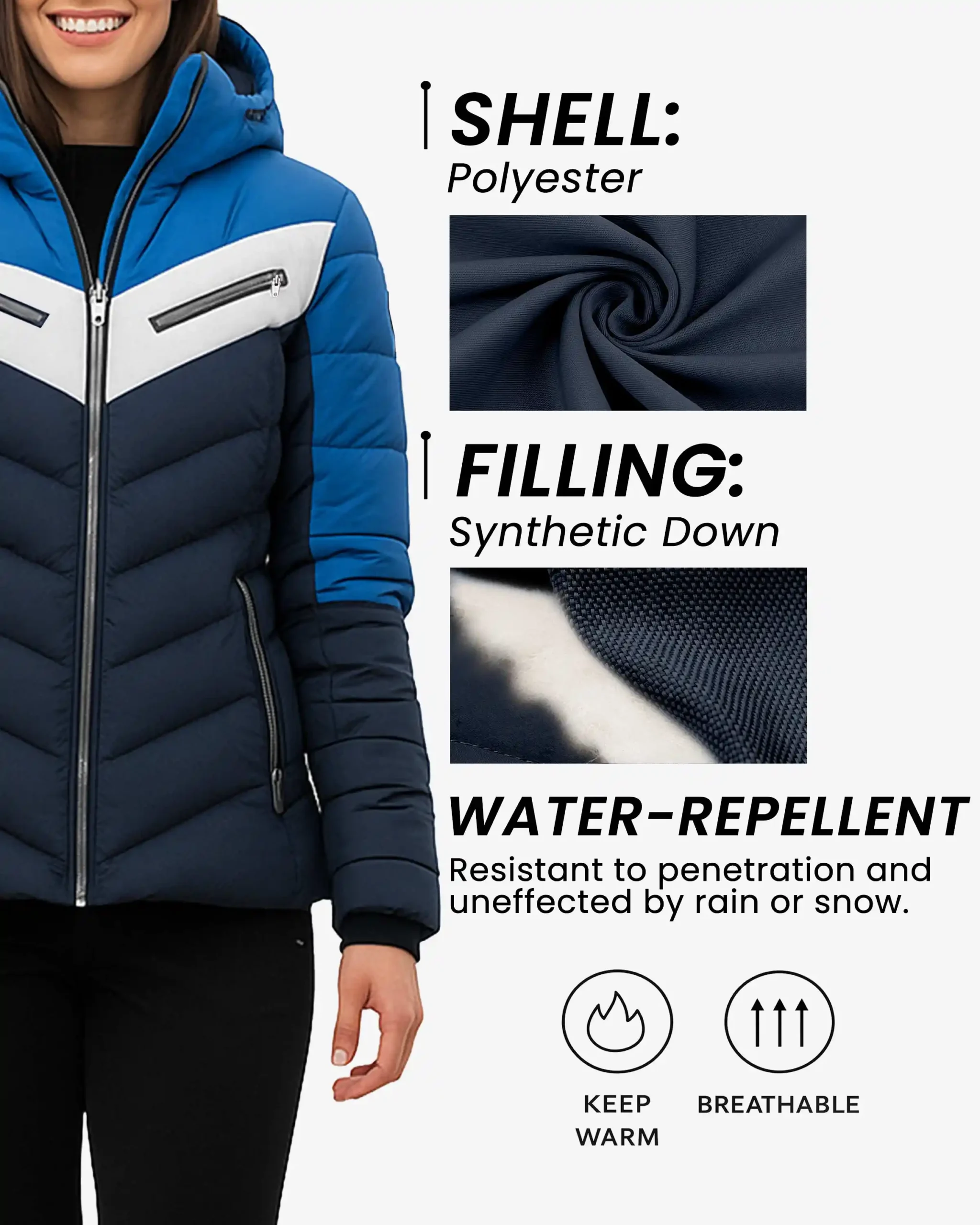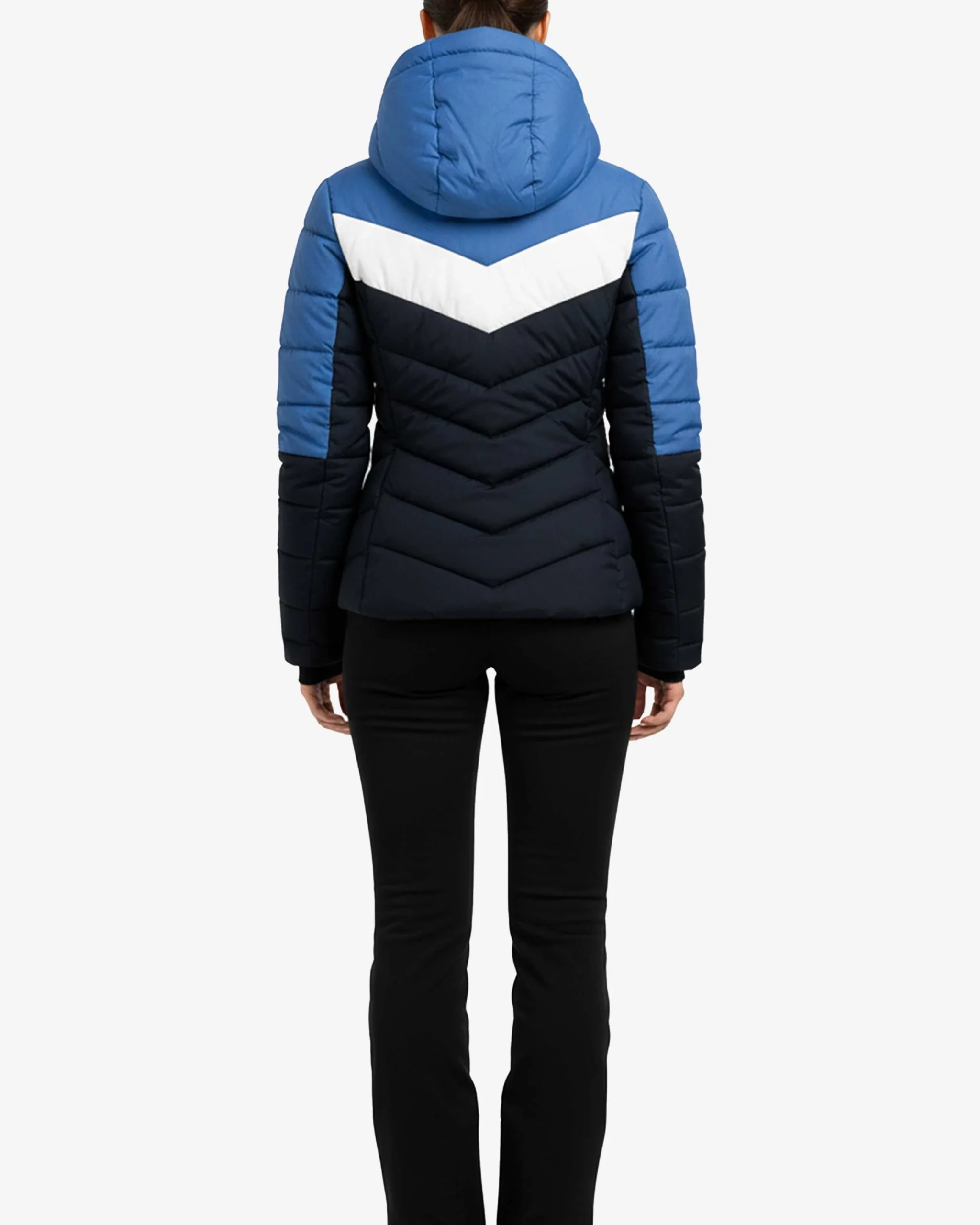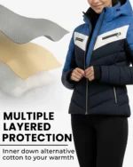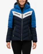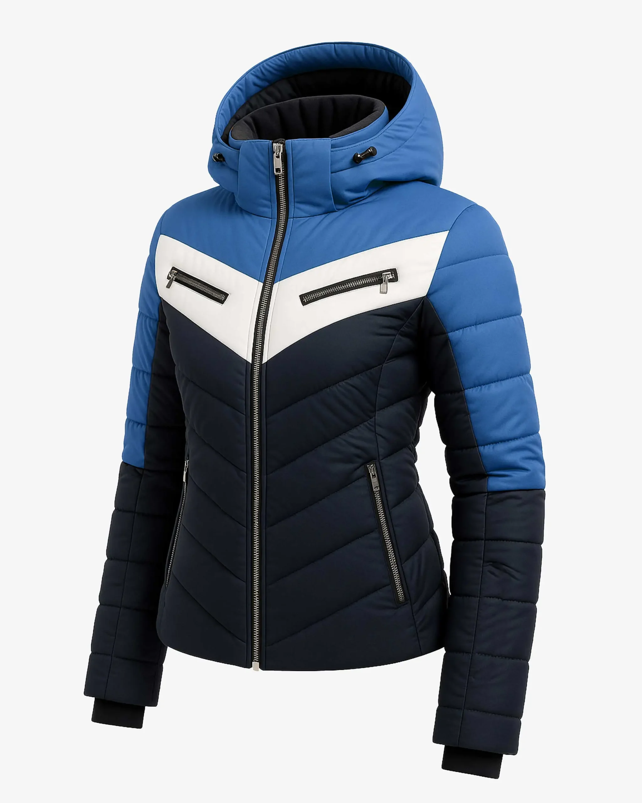 Tricolor Chevron Design – The striking combination of bright blue upper panels, crisp white chevron stripe across the chest, and deep navy lower body creates a dynamic, athletic aesthetic inspired by classic ski apparel. This bold color blocking not only makes a strong visual statement but also creates a flattering, elongated silhouette that enhances your natural shape while standing out on the mountain or city streets.