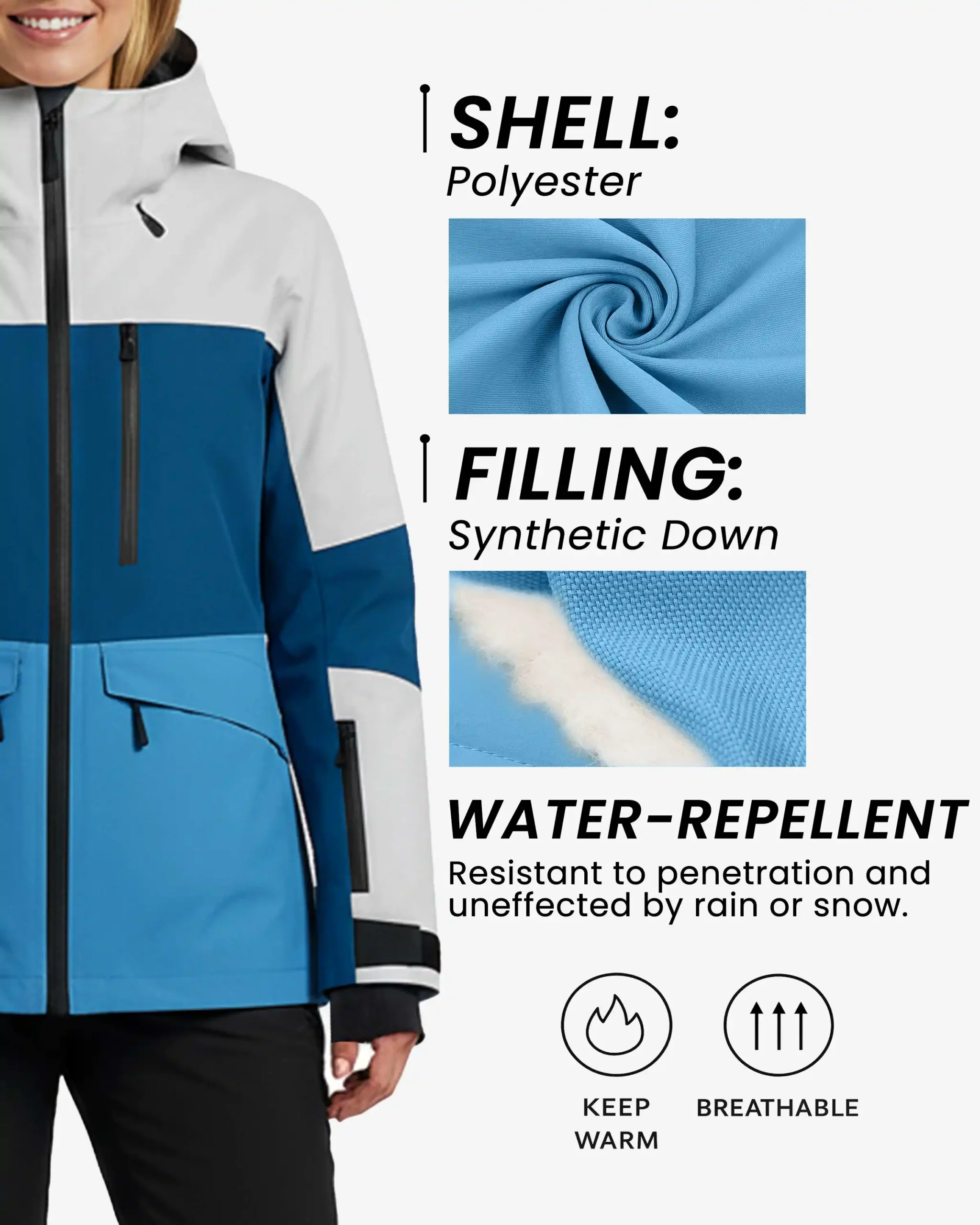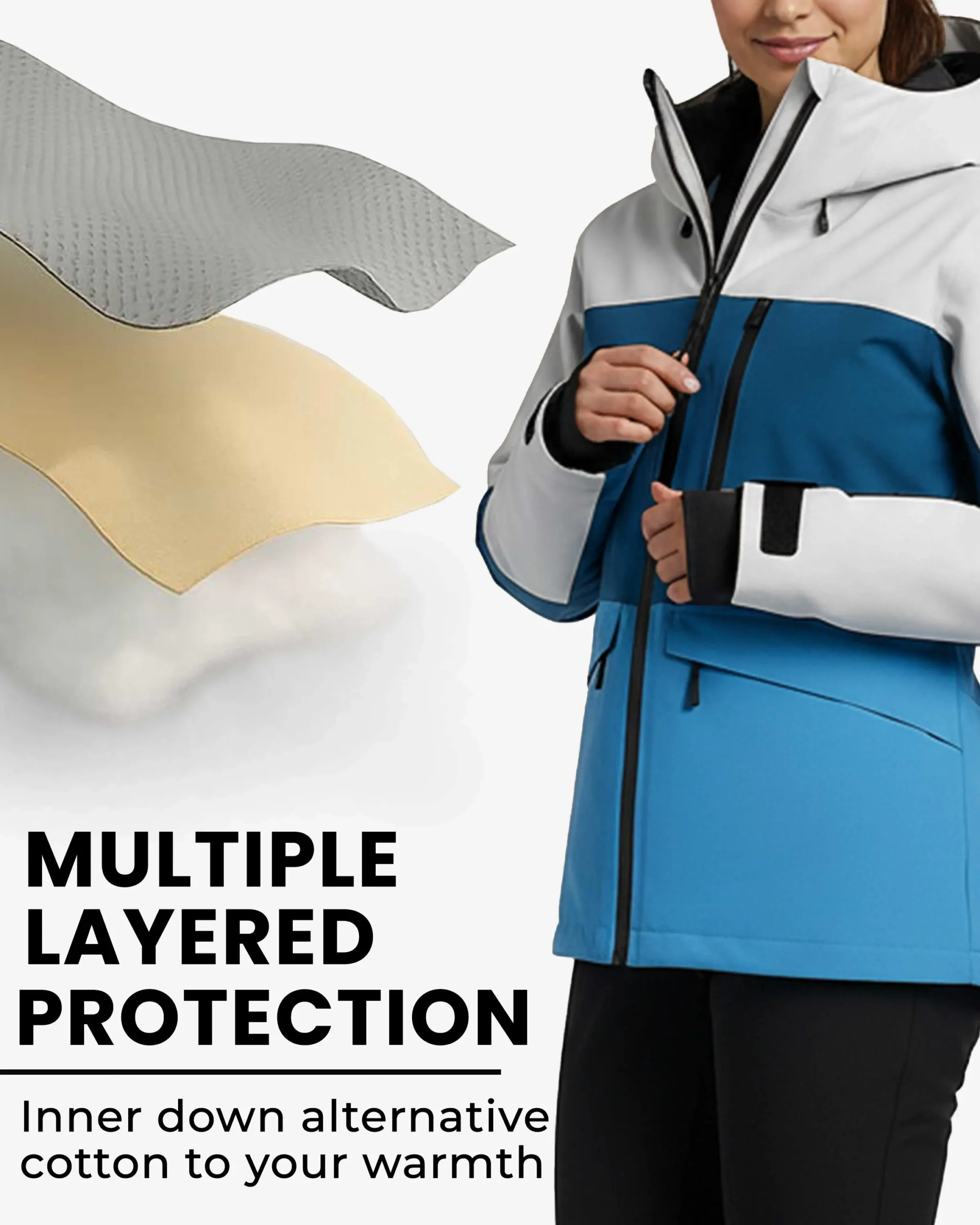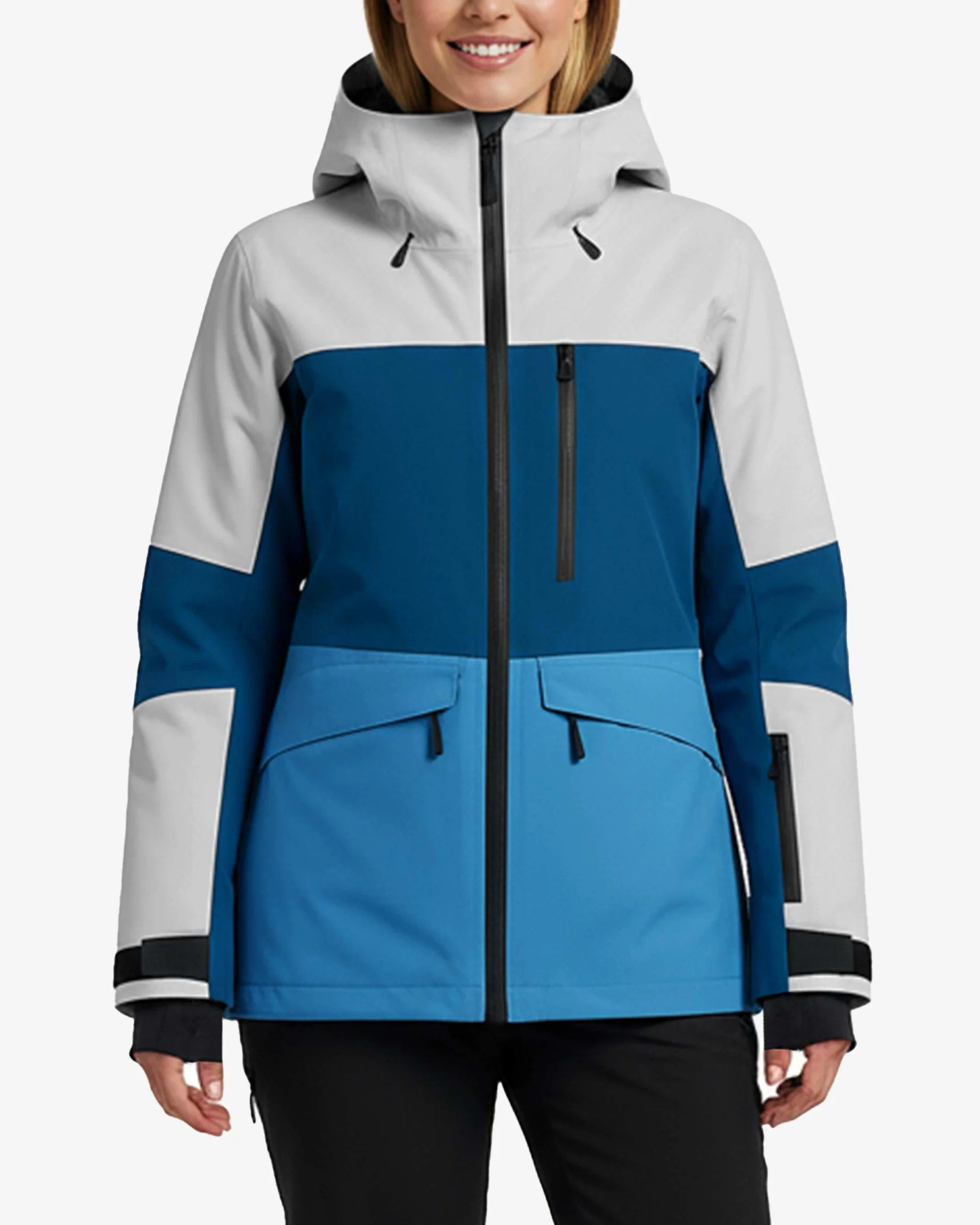Multi-Color Colorblock Design – The eye-catching combination of crisp white upper panels, rich teal and deep navy mid-sections, and bright sky blue lower body creates a sophisticated, athletic aesthetic that stands out on the slopes. This strategic color placement not only delivers bold visual impact but also creates a flattering, elongated silhouette that enhances your natural shape while making a confident style statement on and off the mountain.
