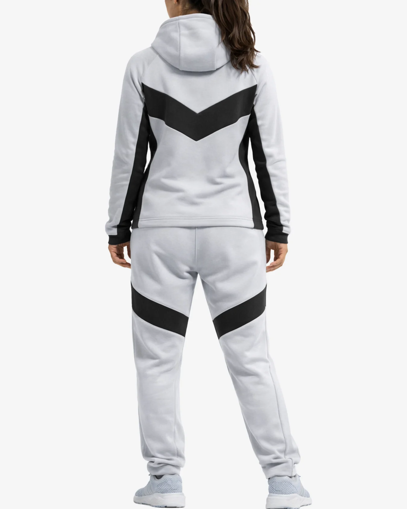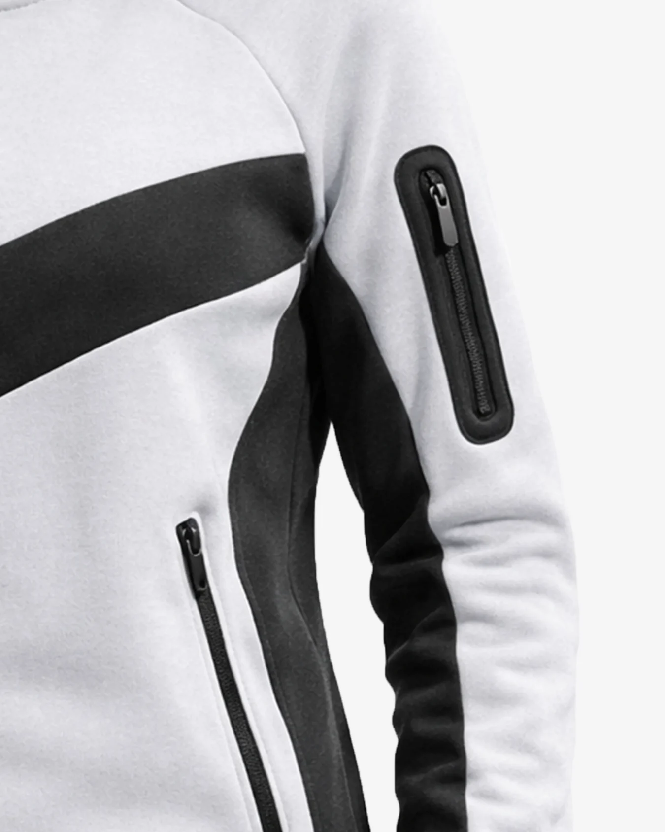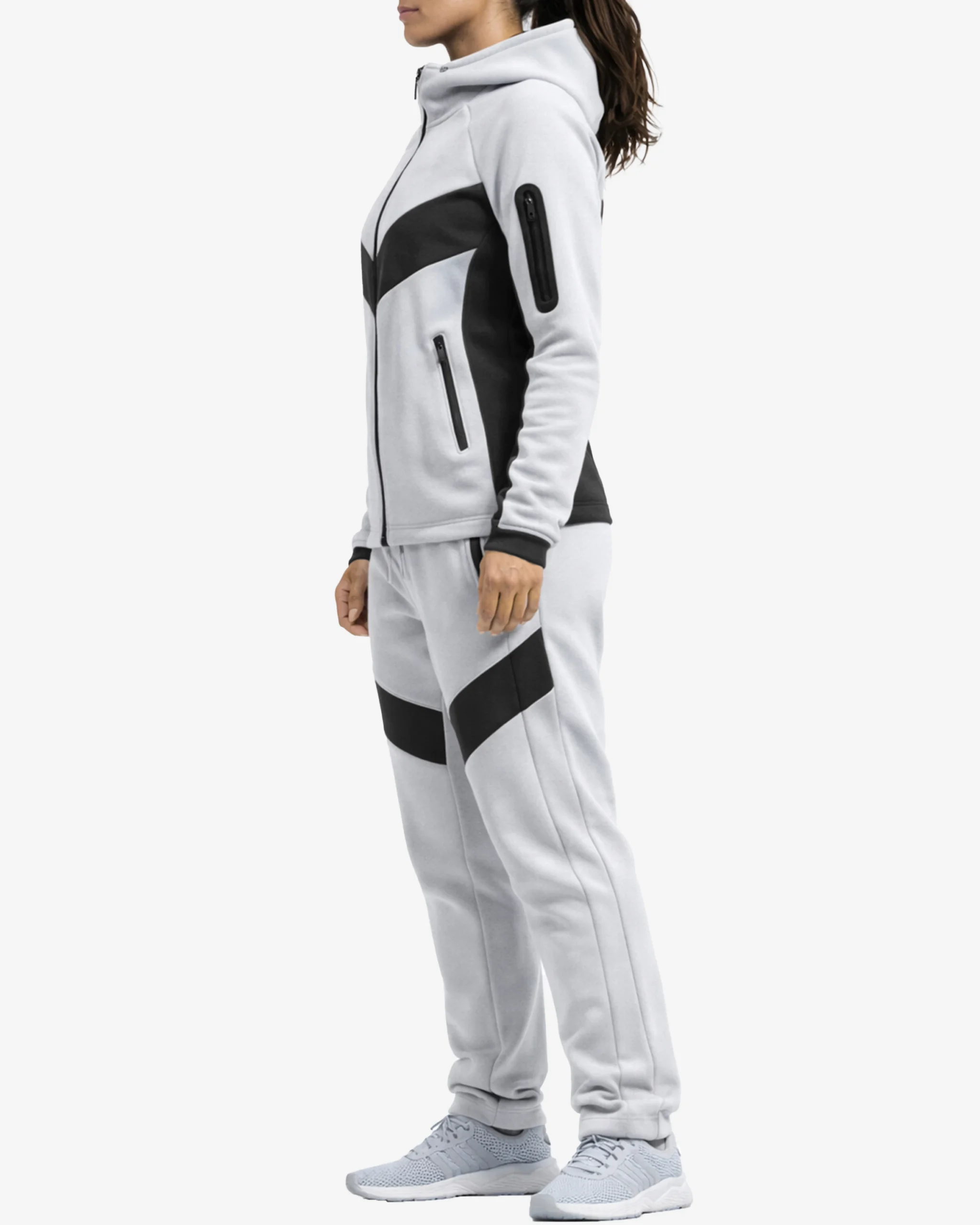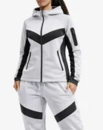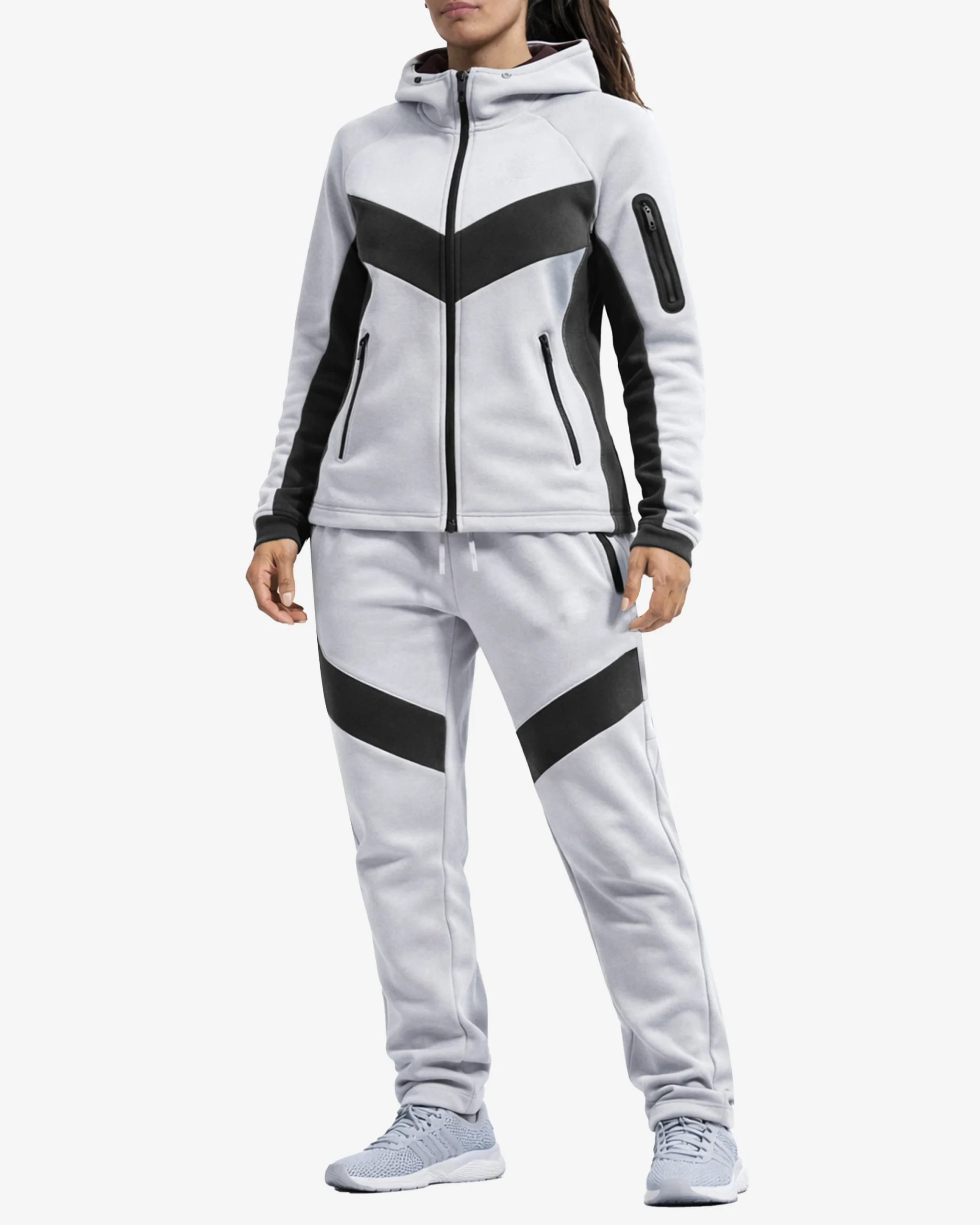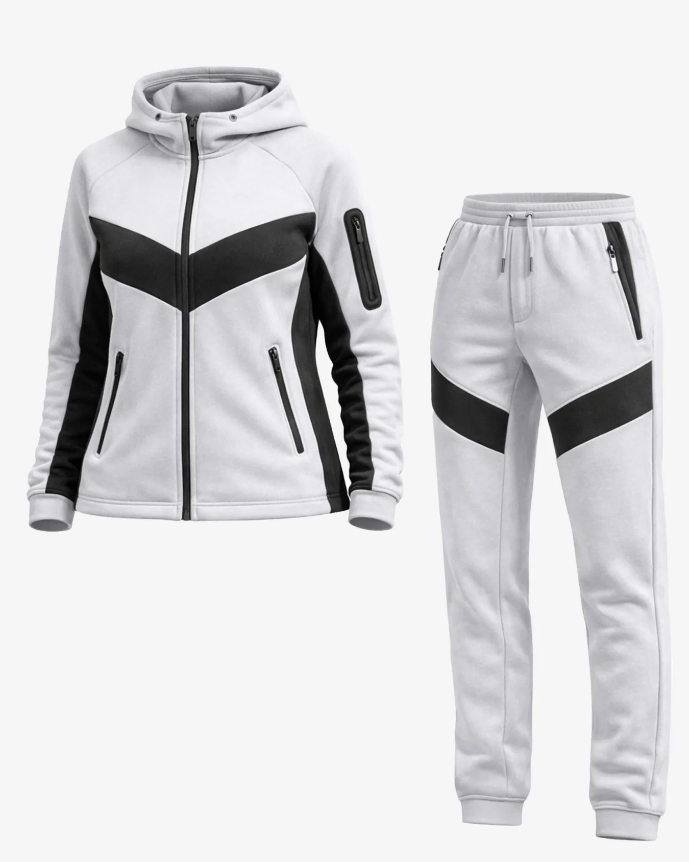 The Urban Glide tracksuit showcases a sophisticated white base elevated by striking black chevron paneling that runs across the chest and legs. This geometric design isn’t just visually appealing – it’s strategically placed to create a slimming, elongated silhouette that flatters every body type. The contrast between the pristine white fabric and broad black accents creates a dynamic, eye-catching look that stands out in any setting.