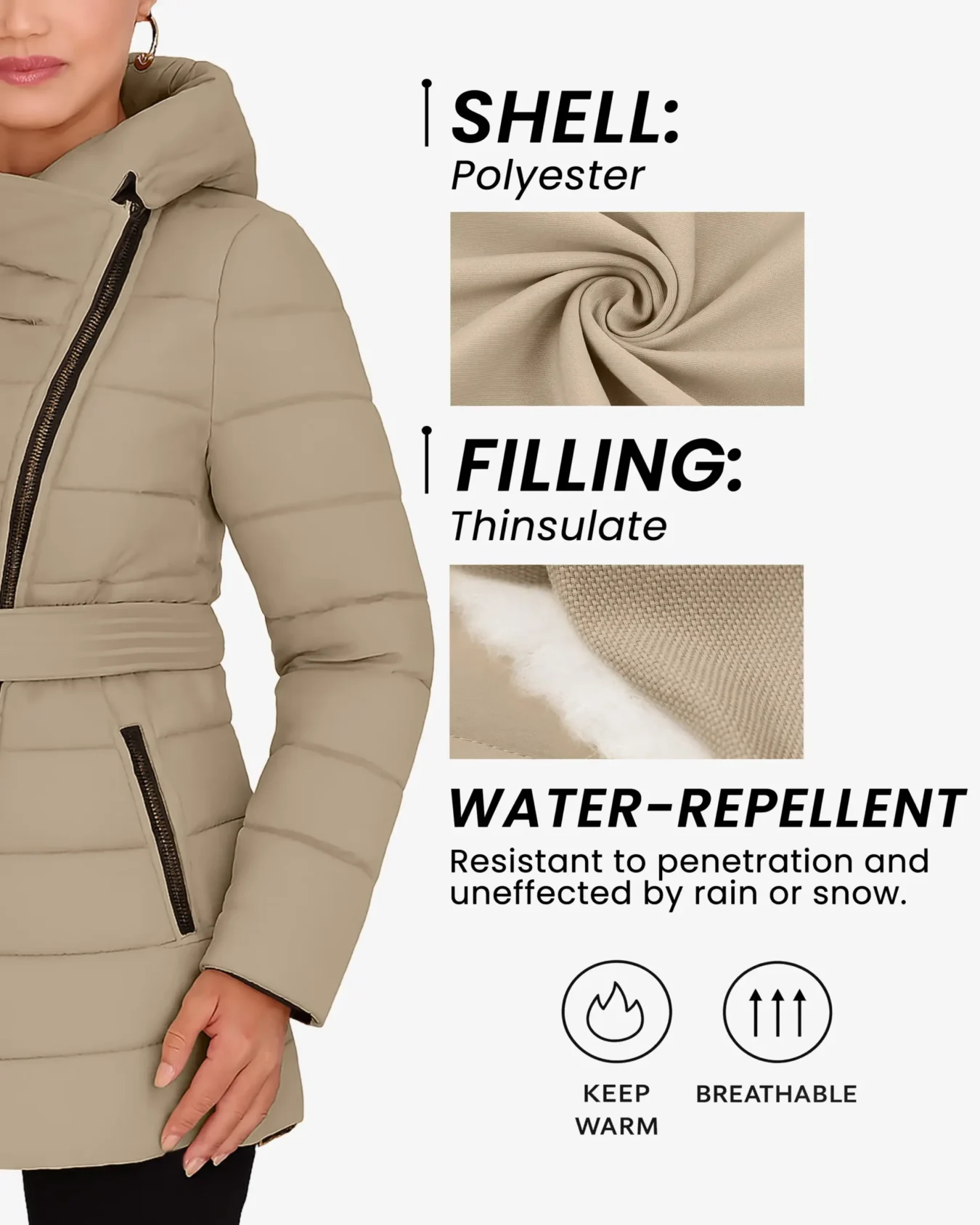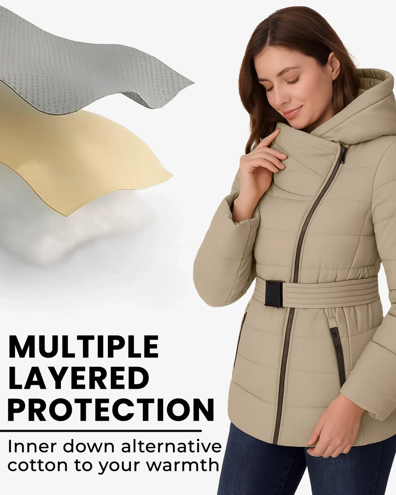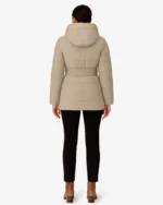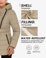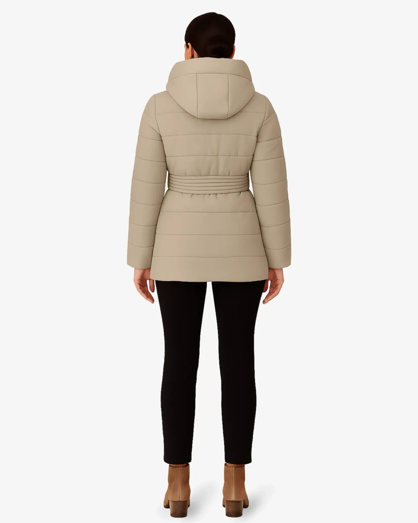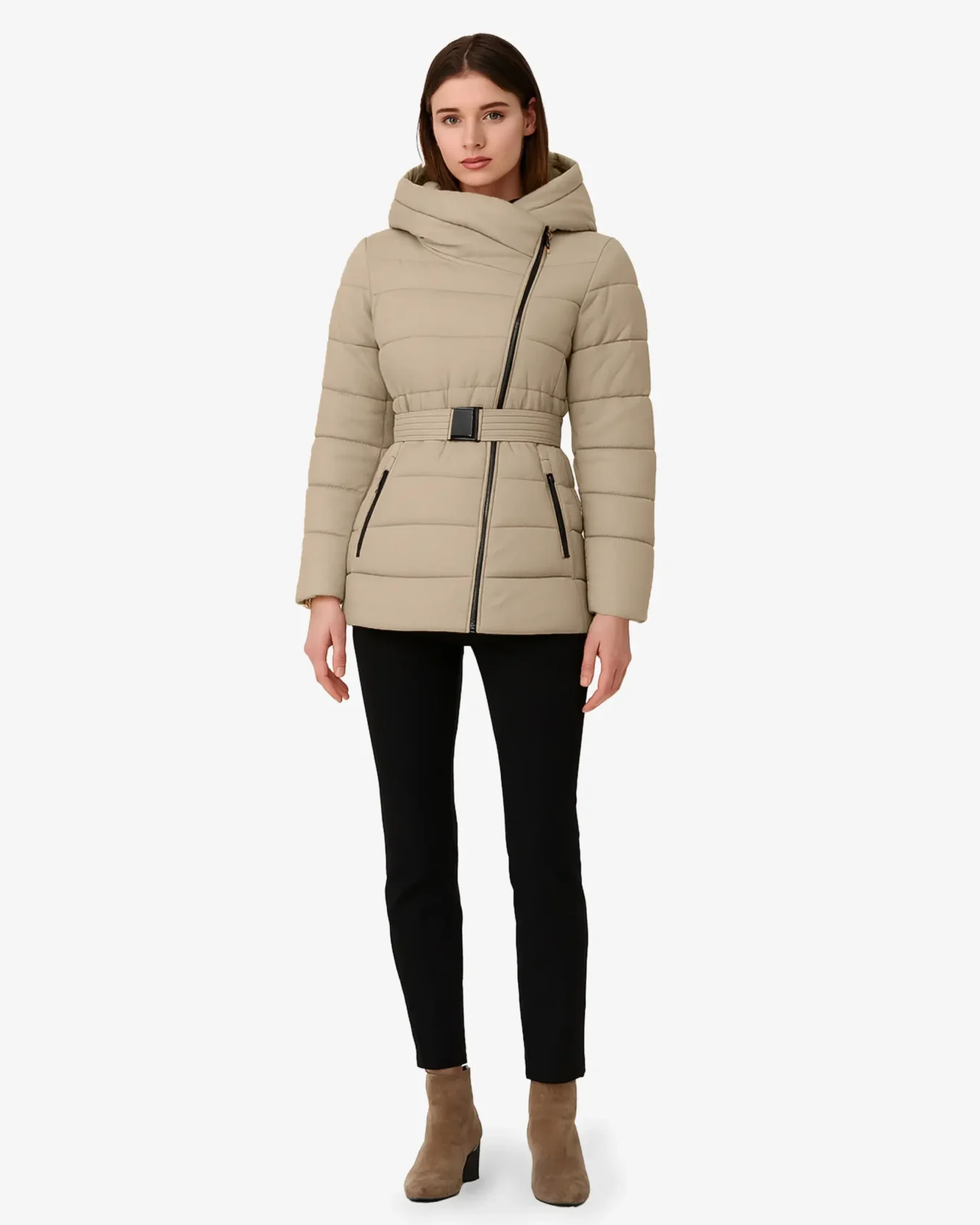 Long puffer jacket with a flattering belted waist design