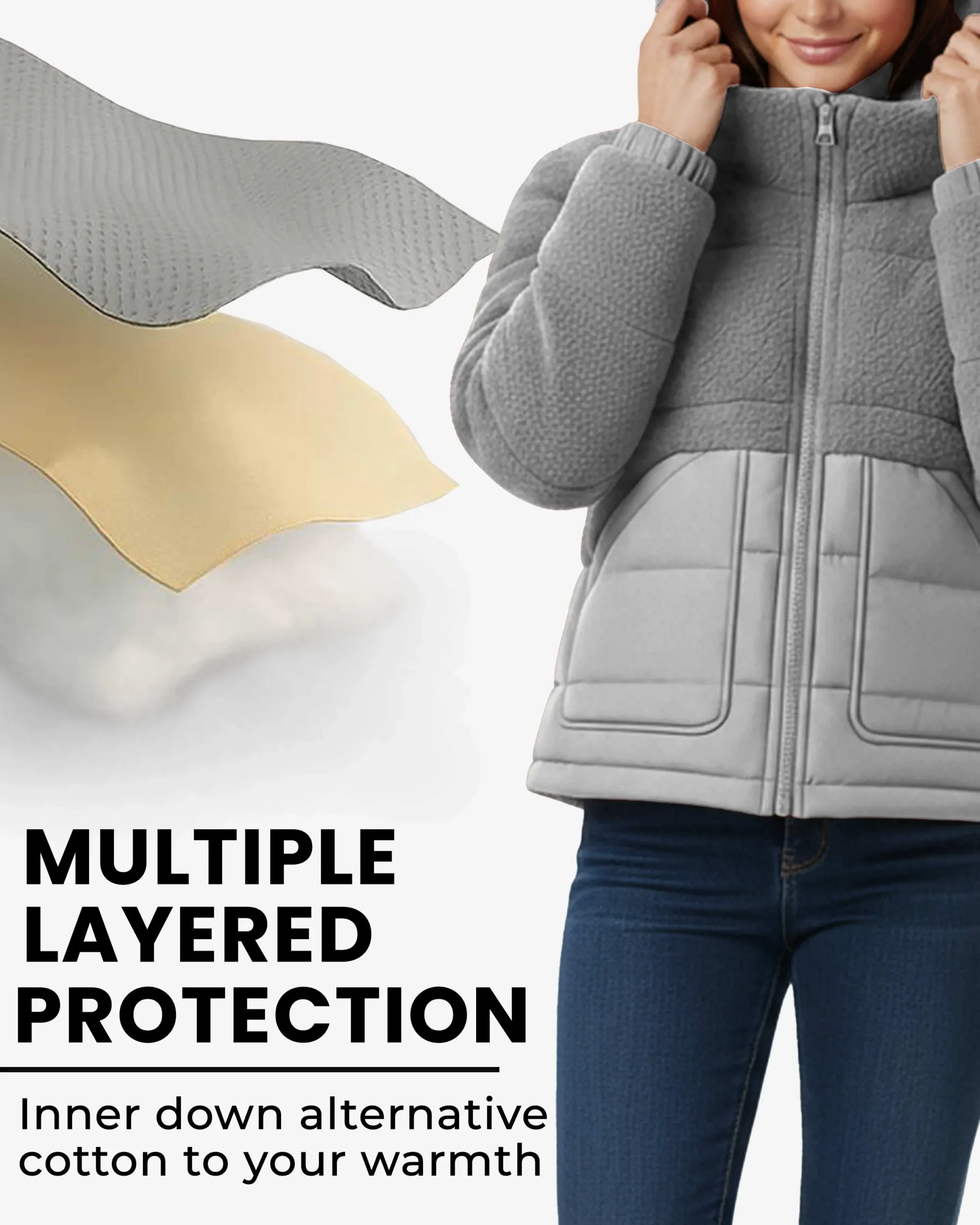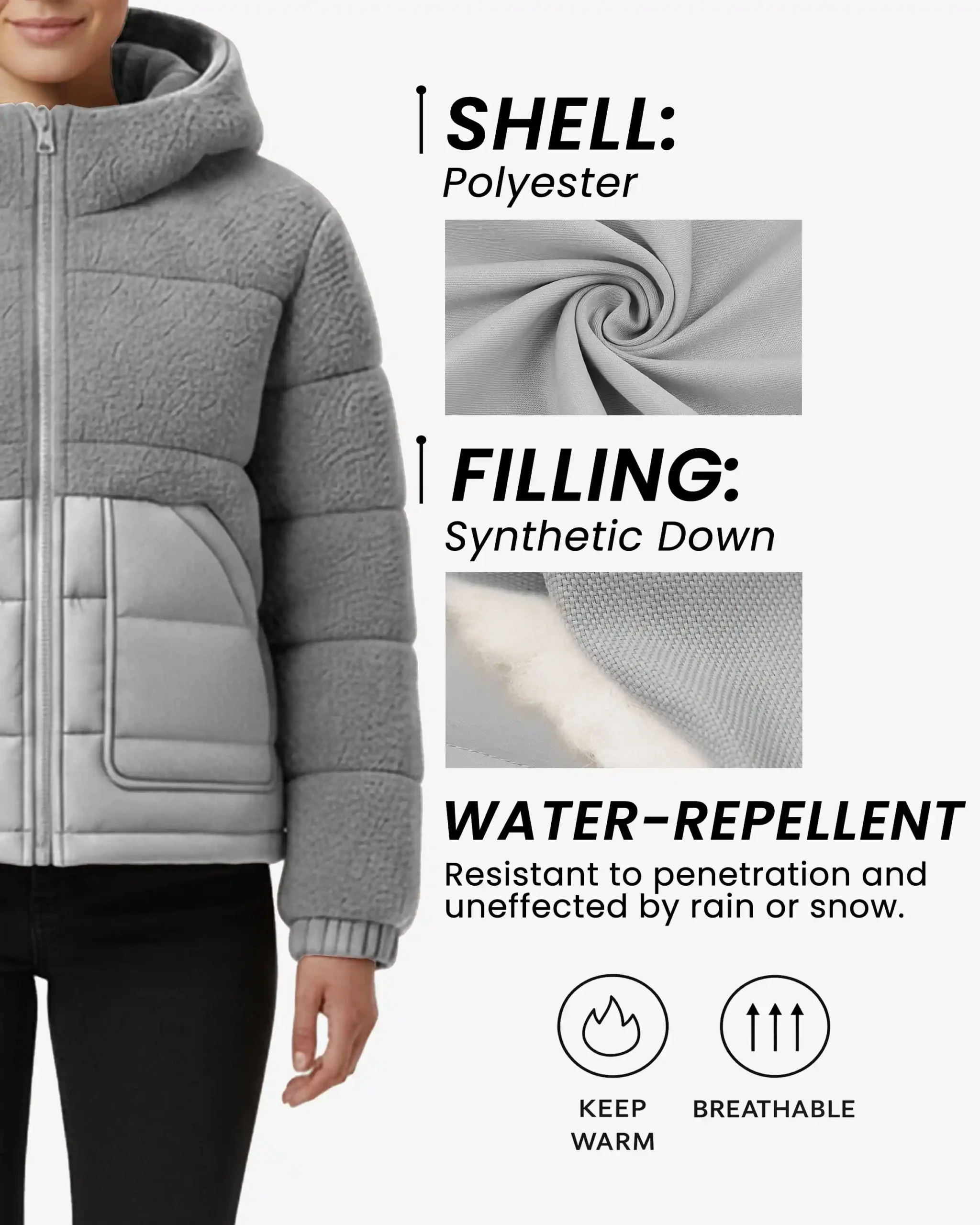 Superior Insulation – Filled with high-quality synthetic down alternative that delivers exceptional warmth without the weight or maintenance requirements of traditional down. The insulation is strategically distributed throughout both the textured fleece and quilted sections, ensuring consistent warmth across your entire torso while maintaining the jacket’s flattering silhouette.