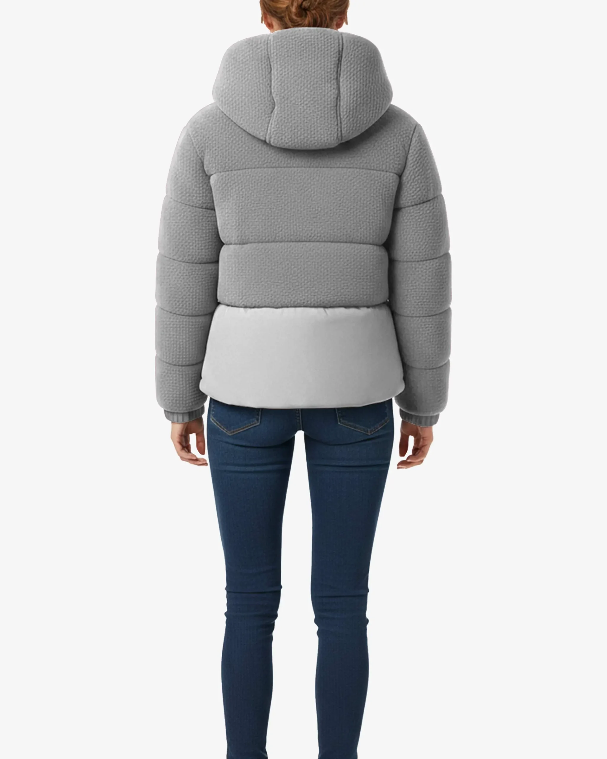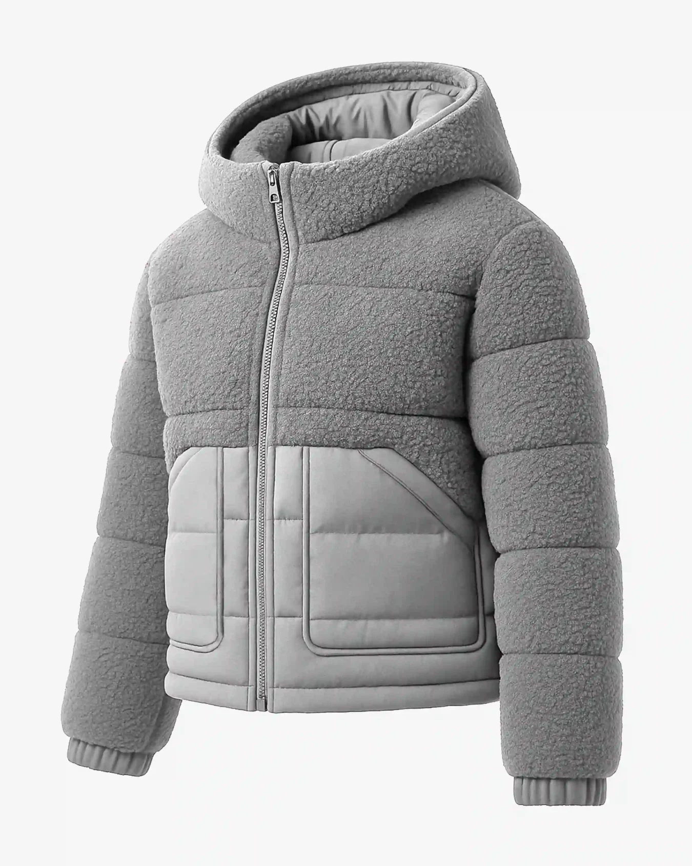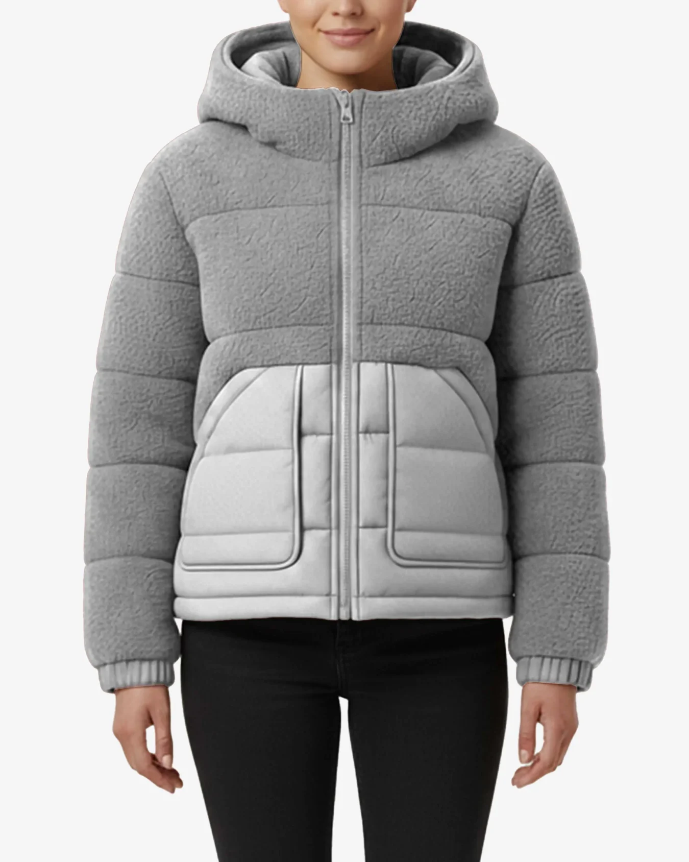 Textured Fleece Construction – The entire upper body, sleeves, and hood feature soft, textured fleece material with a luxurious sherpa-like finish that provides exceptional warmth and comfort. This plush fabric creates a cozy, inviting feel while adding visual interest and tactile appeal that sets this jacket apart from traditional smooth puffers.