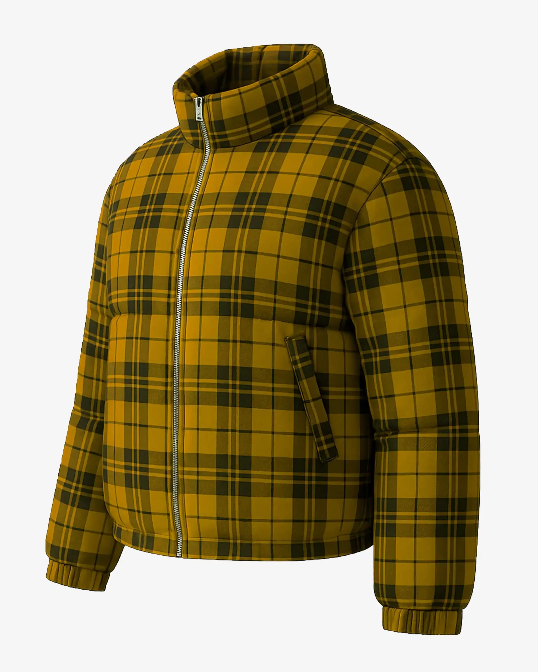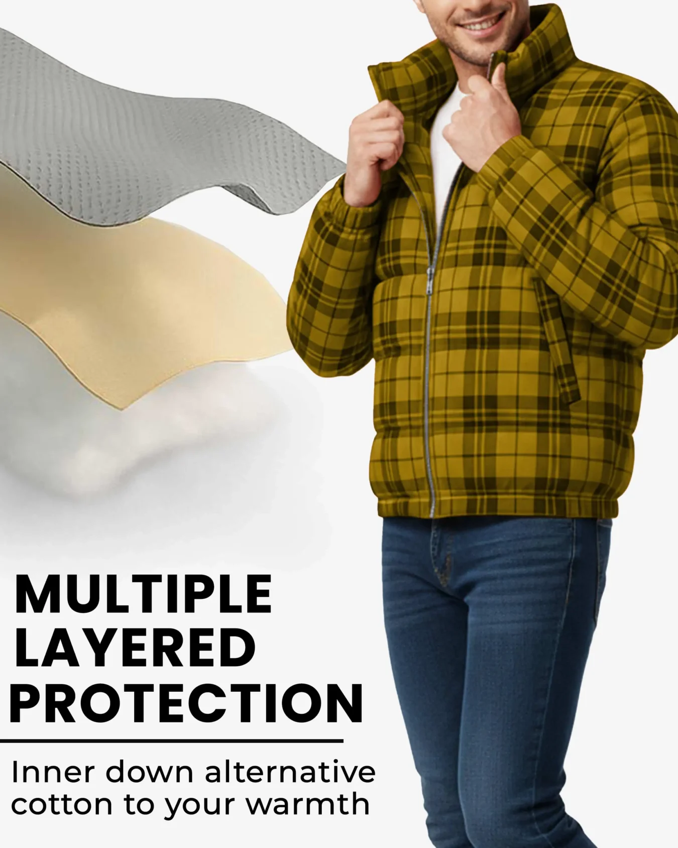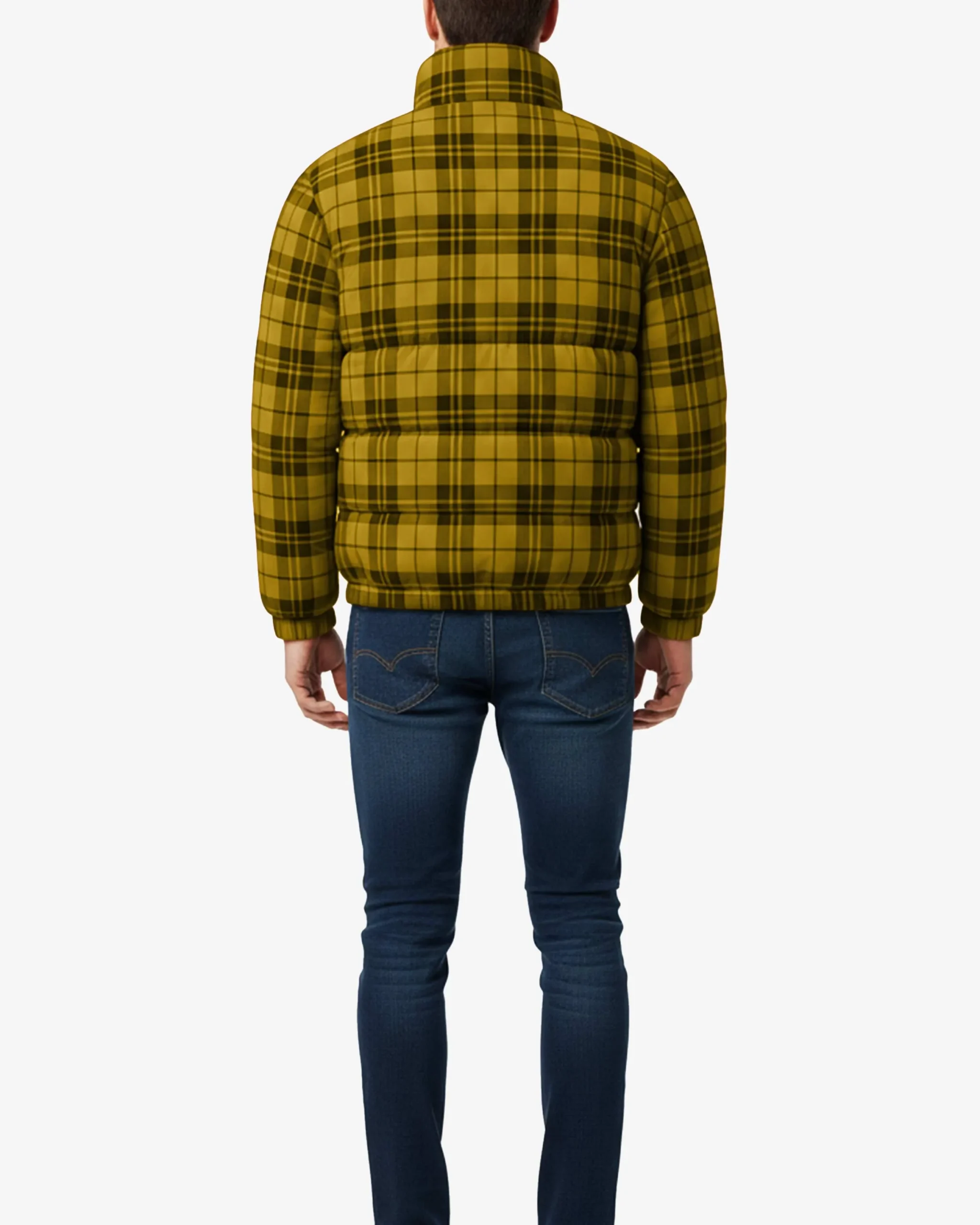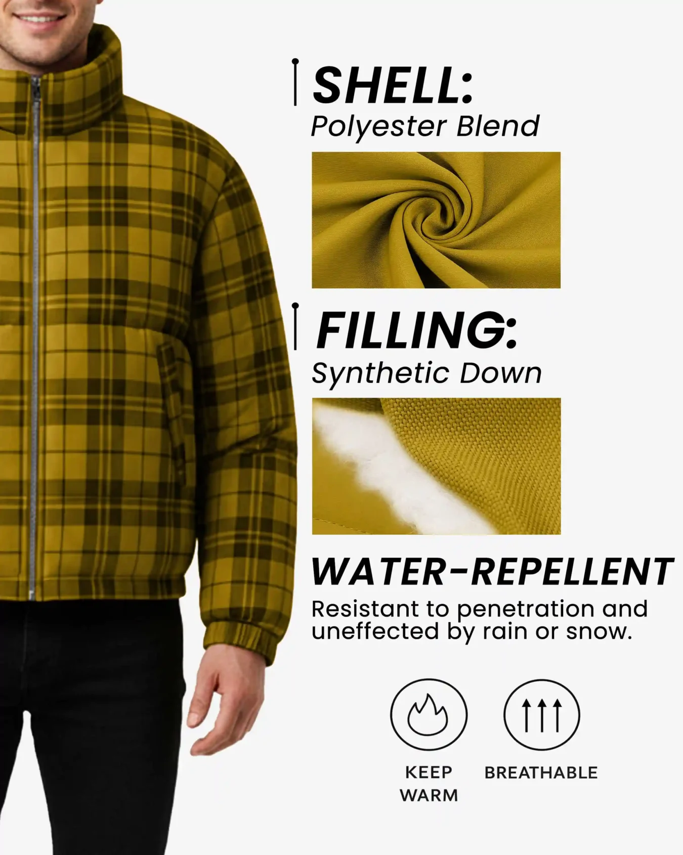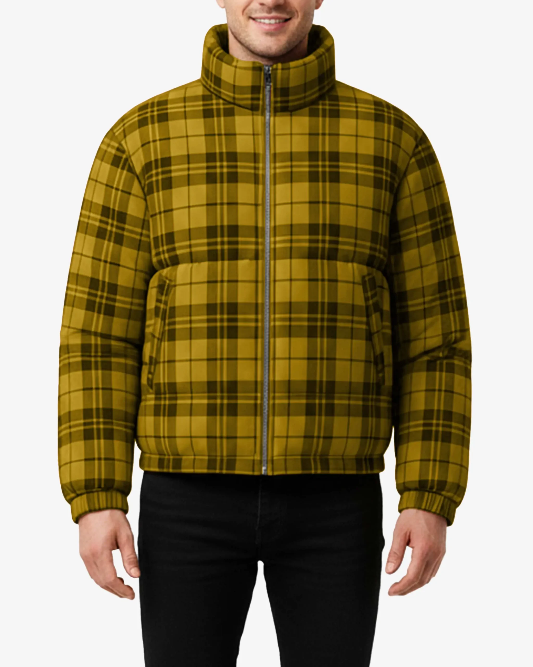 The vibrant yellow and black checkered pattern draws inspiration from traditional woodsman plaids, giving this jacket a rugged outdoor aesthetic that stands out from typical solid-colored puffers. Built with a water-repellent polyester blend shell, this jacket effortlessly sheds light rain and snow while the synthetic down filling delivers reliable warmth without the bulk or maintenance concerns of traditional down.