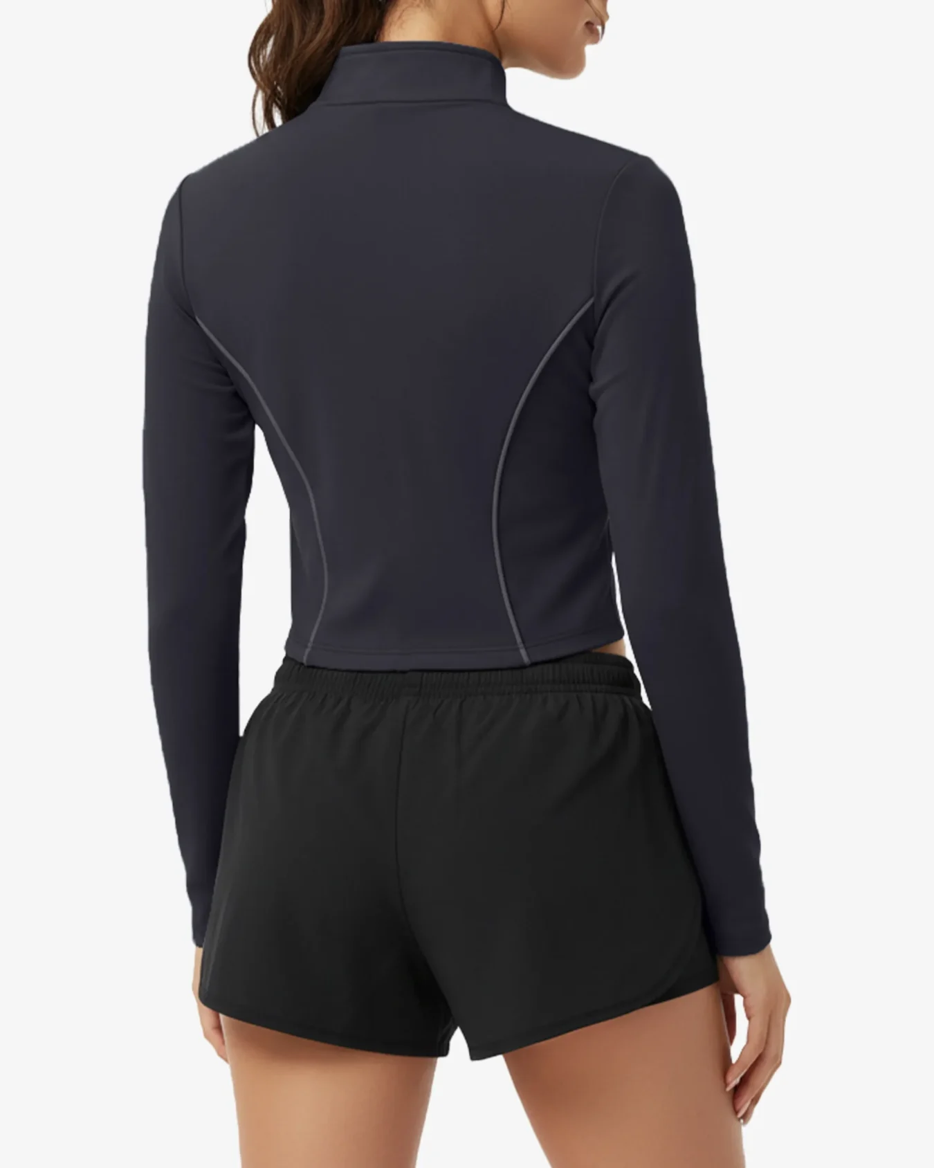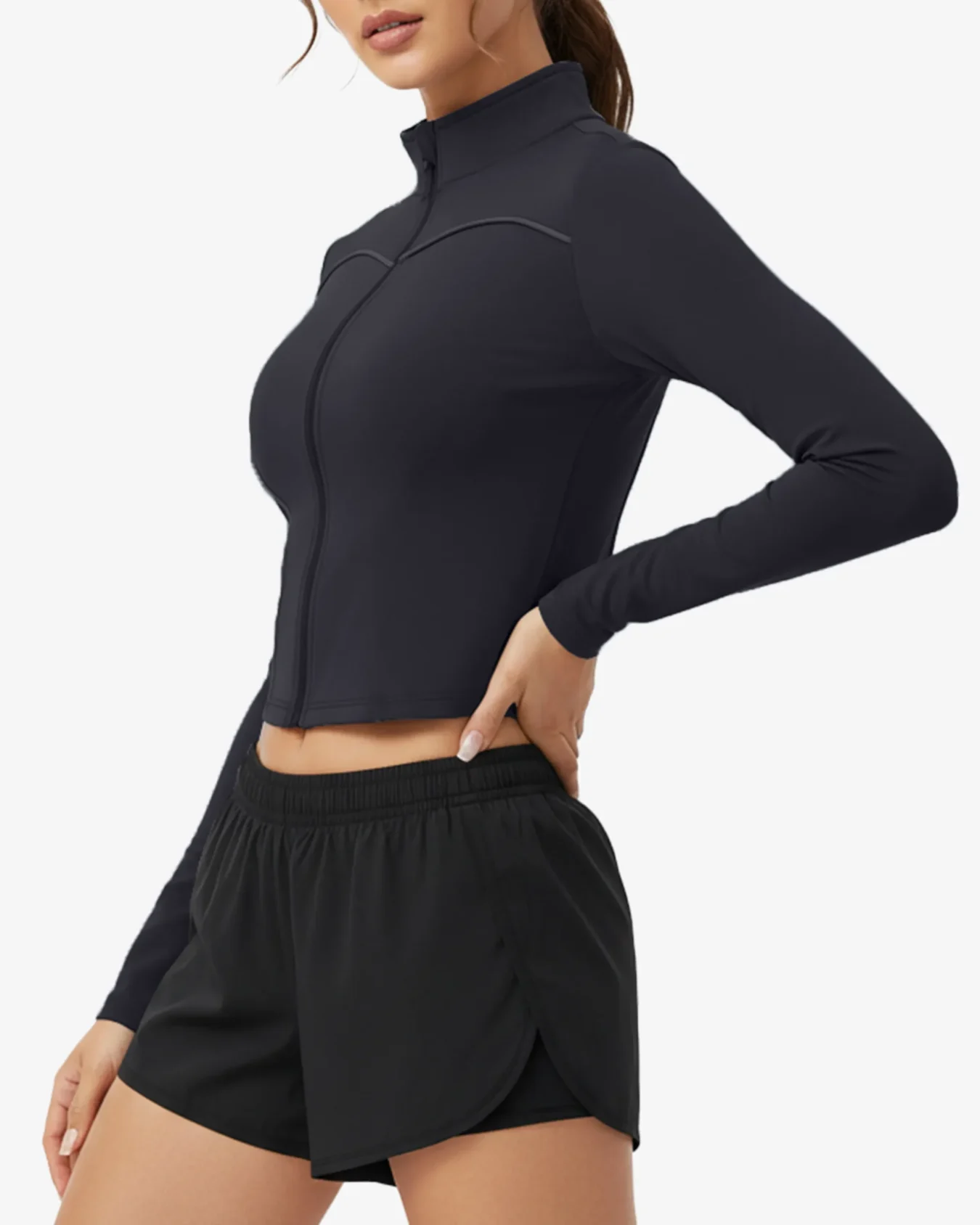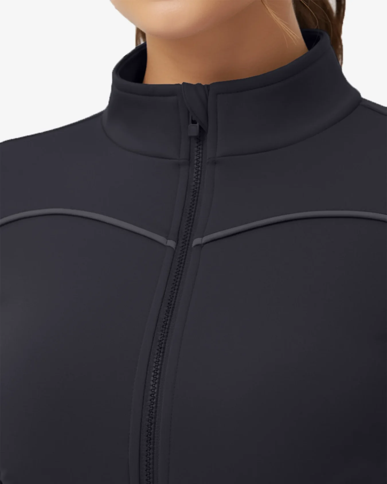 Zyra is a streamlined layer for cool starts, warm-ups, and studio sessions. It feels soft, moves with you, and gives light coverage without bulk. The high stand collar and tidy piping keep the look sharp while you train.